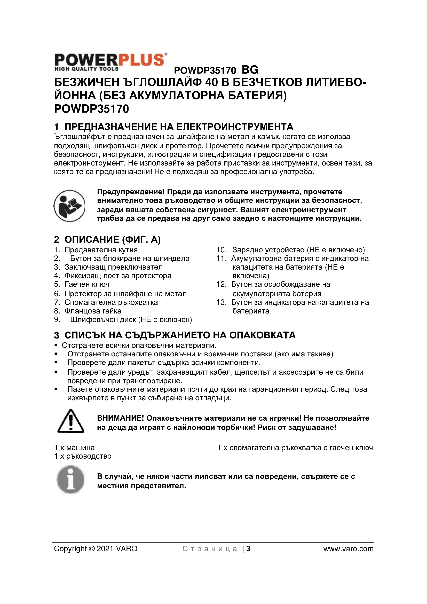 - 17 ДЕКЛАРАЦИЯ ЗА СЪОТВЕТСТВИЕ POWDP35170 BG Copyright © 2021 VARO С т р а н и ц а | 3 www.varo.com БЕЗЖИЧЕН ЪГЛОШЛАЙФ 40 В БЕЗЧЕТКОВ ЛИТИЕВО- ЙОННА (БЕЗ АКУМУЛАТОРНА БАТЕРИЯ) POWDP35170 1 ПРЕДНАЗНАЧЕНИЕ НА ЕЛЕКТРОИНСТРУМЕНТА Ъглошлайфът е предназначен за шлайфане на метал и камък, когато се използва подходящ шлифовъчен диск и протектор. Прочетете всички предупреждения за безопасност, инструкции, илюстрации и спецификации предоставени с този електроинструмент. Не използвайте за работа приставки за инструменти, освен тези, за която те са предназначени! Не е подходящ за професионална употреба. Предупреждение! Преди да използвате инструмента, прочетете внимателно това ръководство и общите инструкции за безопасност, заради вашата собствена сигурност. Вашият електроинструмент трябва да се предава на друг само заедно с настоящите инструкции. 2 ОПИСАНИЕ (ФИГ. A) p. 15