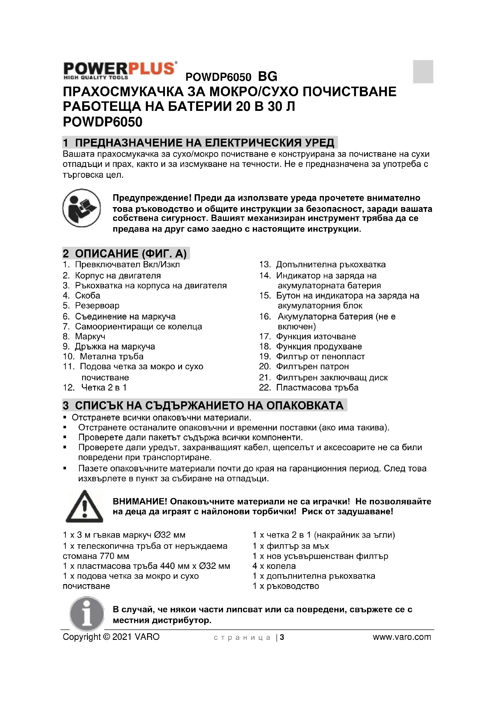 - 17 ДЕКЛАРАЦИЯ ЗА СЪОТВЕТСТВИЕ POWDP6050 BG Copyright © 2021 VARO с т р а н и ц а | 3 www.varo.com ПРАХОСМУКАЧКА ЗА МОКРО/СУХО ПОЧИСТВАНЕ РАБОТЕЩА НА БАТЕРИИ 20 В 30 Л POWDP6050 1 ПРЕДНАЗНАЧЕНИЕ НА ЕЛЕКТРИЧЕСКИЯ УРЕД Вашата прахосмукачка за сухо/мокро почистване е конструирана за почистване на сухи отпадъци и прах, както и за изсмукване на течности. Не е предназначена за употреба с търговска цел. Предупреждение! Преди да използвате уреда прочетете внимателно това ръководство и общите инструкции за безопасност, заради вашата собствена сигурност. Вашият механизиран инструмент трябва да се предава на друг само заедно с настоящите инструкции. 2 ОПИСАНИЕ (ФИГ. A) p. 13