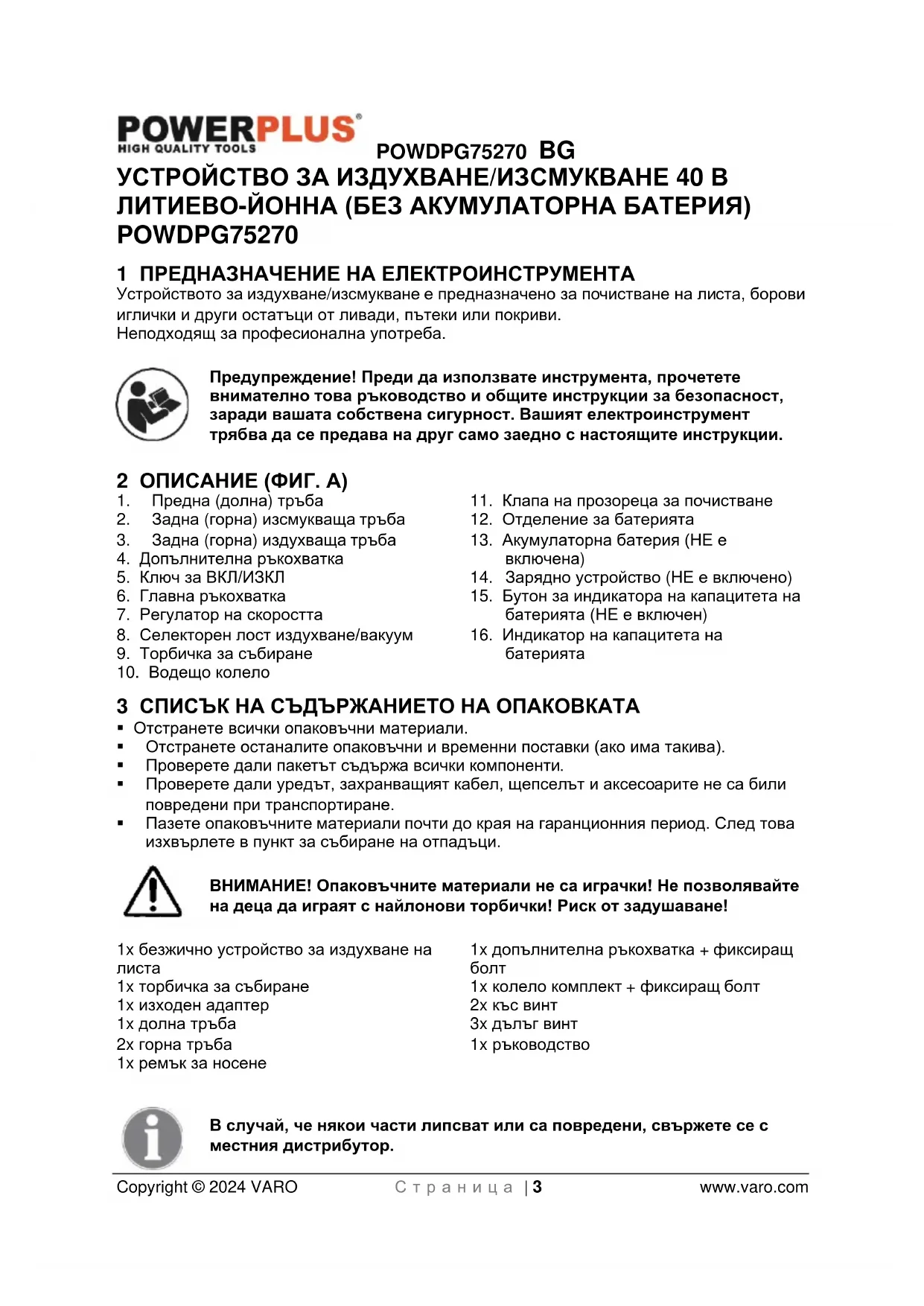 - 16 ДЕКЛАРАЦИЯ ЗА СЪОТВЕТСТВИЕ POWDPG75270 BG Copyright © 2024 VARO С т р а н и ц а | 3 www.varo.com УСТРОЙСТВО ЗА ИЗДУХВАНЕ/ИЗСМУКВАНЕ 40 В ЛИТИЕВО-ЙОННА (БЕЗ АКУМУЛАТОРНА БАТЕРИЯ) POWDPG75270 1 ПРЕДНАЗНАЧЕНИЕ НА ЕЛЕКТРОИНСТРУМЕНТА Устройството за издухване/изсмукване е предназначено за почистване на листа, борови иглички и други остатъци от ливади, пътеки или покриви. Неподходящ за професионална употреба. Предупреждение! Преди да използвате инструмента, прочетете внимателно това ръководство и общите инструкции за безопасност, заради вашата собствена сигурност. Вашият електроинструмент трябва да се предава на друг само заедно с настоящите инструкции. 2 ОПИСАНИЕ (ФИГ. A) p. 15