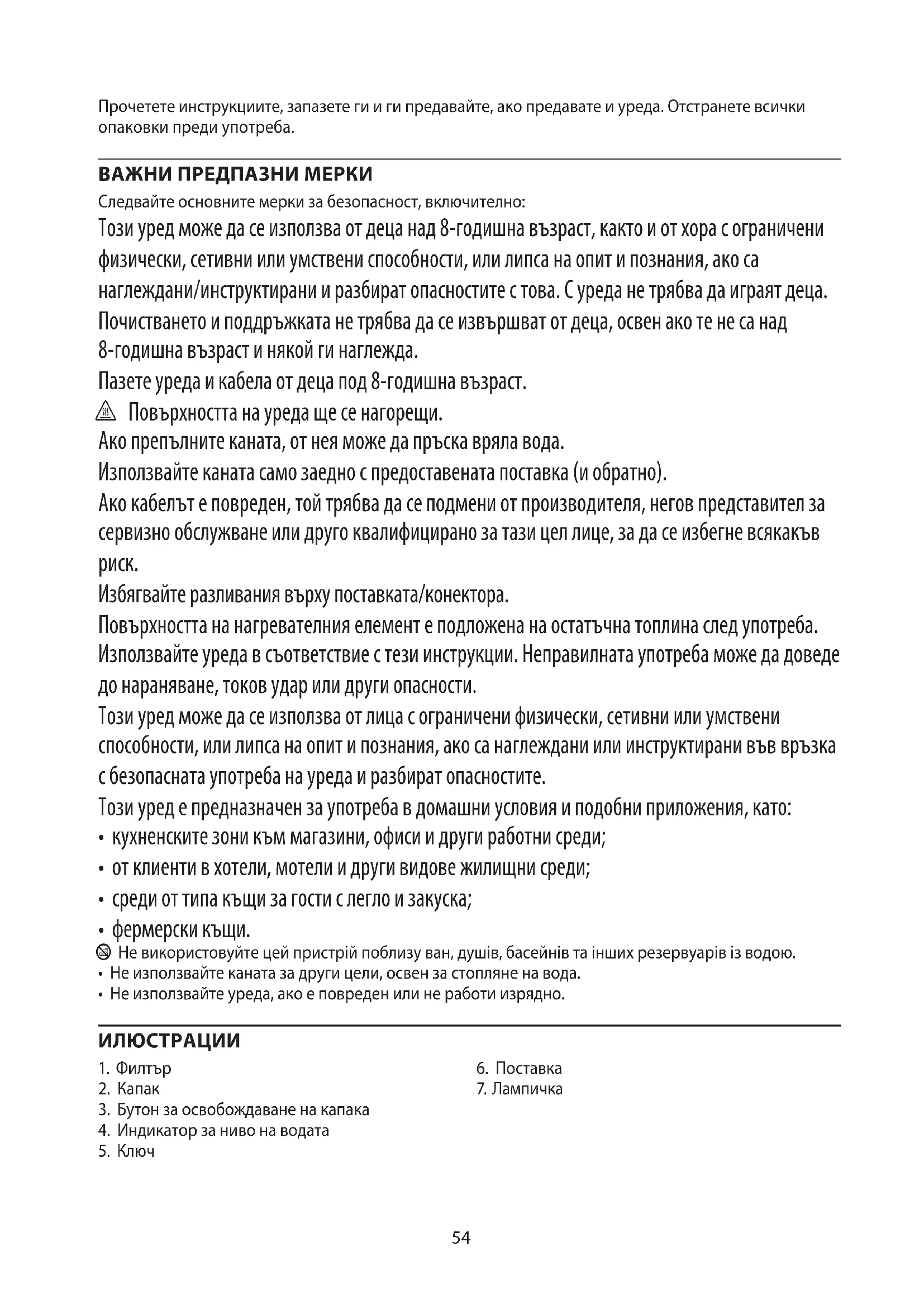 AE54 Прочетете инструкциите, запазете ги и ги предавайте, ако предавате и уреда. Отстранете всички опаковки преди употреба. ВАЖНИ ПРЕДПАЗНИ МЕРКИ Следвайте основните мерки за безопасност, включително: Този уред може да се използва от деца над 8-годишна възраст, както и от хора с ограничени физически, сетивни или умствени способности, или липса на опит и познания, ако са наглеждани/инструктирани и разбират опасностите с това. С уреда не трябва да играят деца. Почистването и поддръжката не трябва да се извършват от деца, освен ако те не са над 8-годишна възраст и някой ги наглежда. Пазете уреда и кабела от деца под 8-годишна възраст. h Повърхността на уреда ще се нагорещи. Ако препълните каната, от нея може да пръска вряла вода. Използвайте каната само заедно с предоставената поставка (и обратно). Ако кабелът е повреден, той трябва да се подмени от производителя, негов представител за сервизно обслужване или друго квалифицирано за тази цел лице, за да се избегне всякакъв