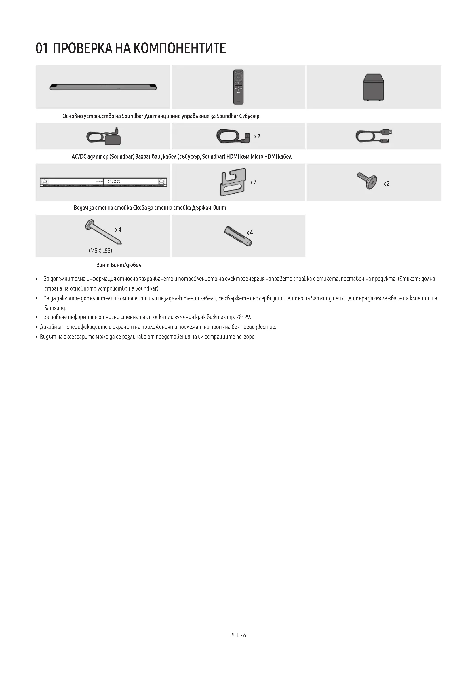 - Комплектът безжични задни високоговорители Samsung може да бъде закупен отделно. За закупуване на комплект се обърнете към търговеца, от който сте закупили своя Soundbar.
