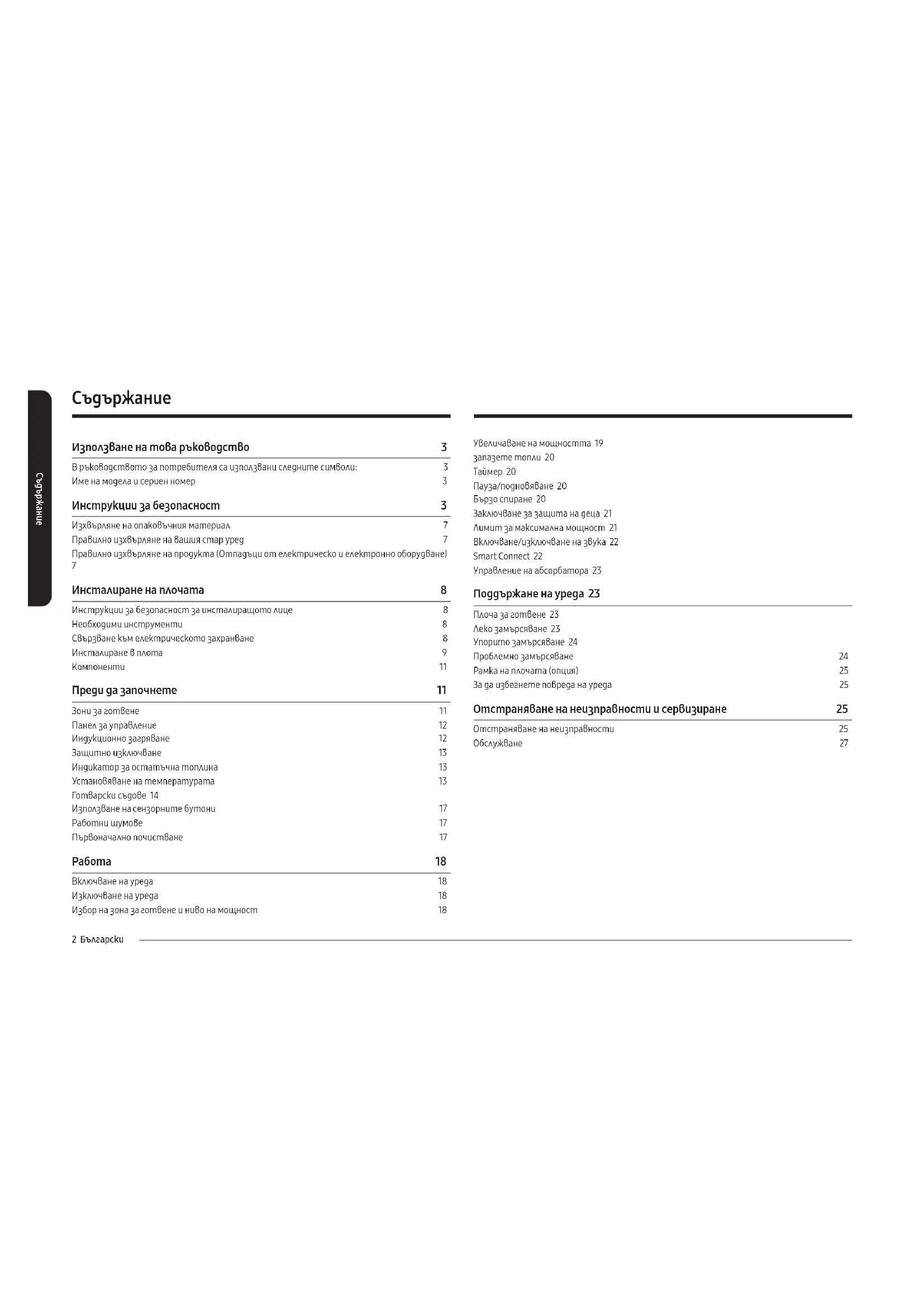 Увеличаване на мощността 19 запазете топли 20 Таймер 20 Пауза/подновяване 20 Бързо спиране 20 Заключване за защита на деца 21 Лимит за максимална мощност 21 Включване/изключване на звука 22 Smart Connect 22 Управление на абсорбатора 23 Поддържане на уреда 23 Плоча за готвене 23 Леко замърсяване 23 Упорито замърсяване 24 Проблемно замърсяване 24 Рамка на плочата (опция) 25 За да избегнете повреда на уреда 25 Отстраняване на неизправности и сервизиране 25 Отстраняване на неизправности 25 Обслужване 27