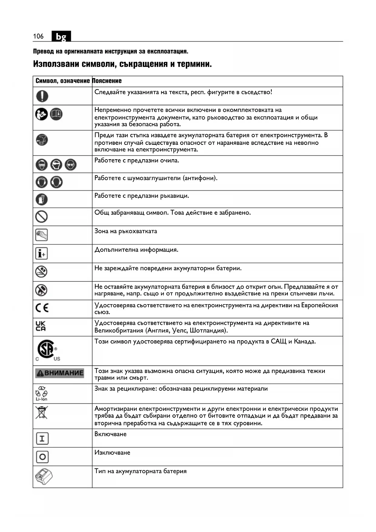 Превод на оригиналната инструкция за експлоатация. Използвани символи, съкращения и термини. Символ, означение Пояснение Следвайте указанията на текста, респ. фигурите в съседство! Непременно прочетете всички включени в окомплектовката на електроинструмента документи, като ръководство за експлоатация и общи указания за безопасна работа. Преди тази стъпка извадете акумулаторната батерия от електроинструмента. В противен случай съществува опасност от нараняване вследствие на неволно включване на електроинструмента. Работете с предпазни очила. Работете с шумозаглушители (антифони). Работете с предпазни ръкавици. Общ забраняващ символ. Това действие е забранено. Зона на ръкохватката Допълнителна информация. Не зареждайте повредени акумулаторни батерии. Не оставяйте акумулаторната батерия в близост до открит огън. Предпазвайте я от нагряване, напр. също и от продължително въздействие на преки слънчеви лъчи. Удостоверява съответствието на електроинструмента на директиви на Европейския