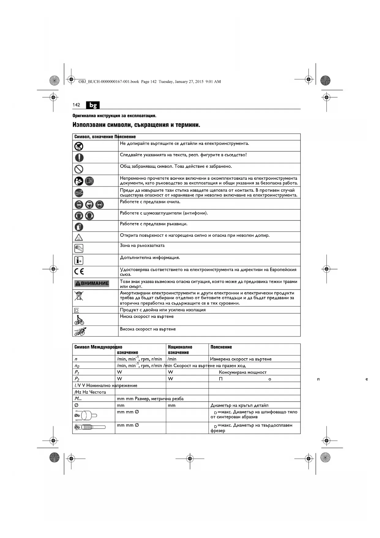 Оригинална инструкция за експлоатация. Използвани символи, съкращения и термини. Символ, означение Пояснение Не допирайте въртящите се детайли на електроинструмента. Следвайте указанията на текста, респ. фигурите в съседство! Общ забраняващ символ. Това действие е забранено. Непременно прочетете всички включени в окомплектовката на електроинструмента документи, като ръководство за експлоатация и общи указания за безопасна работа. Преди да извършите тази стъпка извадете щепсела от контакта. В противен случай съществува опасност от нараняване при неволно включване на електроинструмента. Работете с предпазни очила. Работете с шумозаглушители (антифони). Работете с предпазни ръкавици. Открита повърхност е нагорещена силно и опасна при неволен допир. Зона на ръкохватката Допълнителна информация. Удостоверява съответствието на електроинструмента на директиви на Европейския