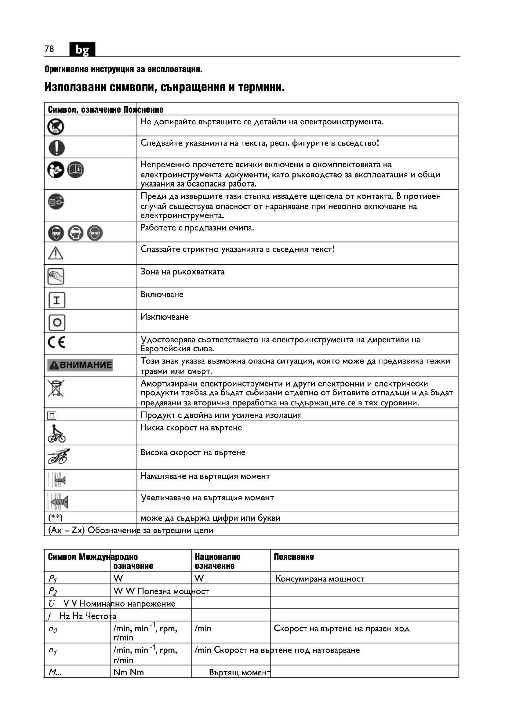 Оригинална инструкция за експлоатация. Използвани символи, съкращения и термини. Символ, означение Пояснение Не допирайте въртящите се детайли на електроинструмента. Следвайте указанията на текста, респ. фигурите в съседство! Непременно прочетете всички включени в окомплектовката на електроинструмента документи, като ръководство за експлоатация и общи указания за безопасна работа. Преди да извършите тази стъпка извадете щепсела от контакта. В противен случай съществува опасност от нараняване при неволно включване на електроинструмента. Работете с предпазни очила. Спазвайте стриктно указанията в съседния текст! Зона на ръкохватката