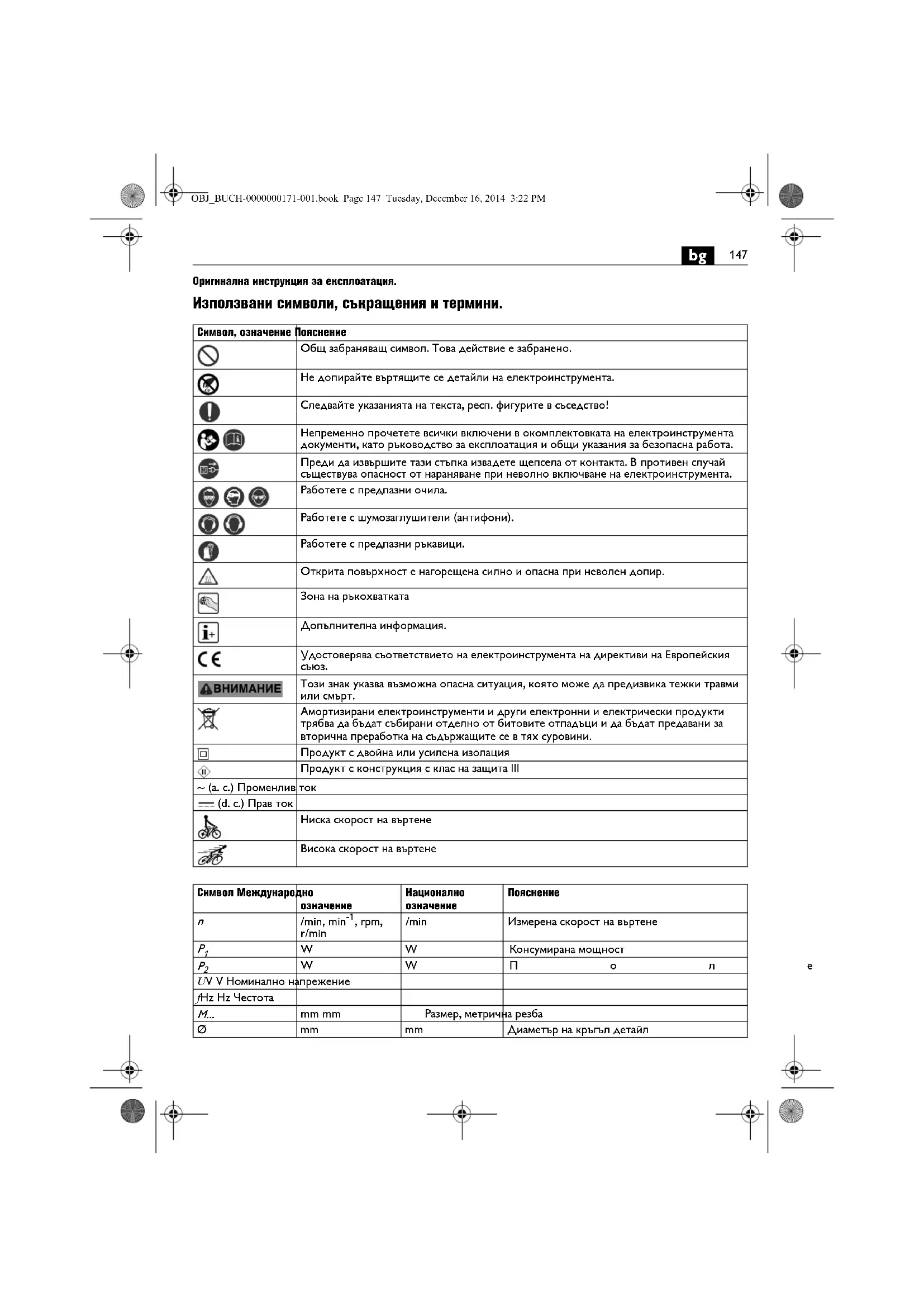 WWПолезна мощност U V V Номинално напрежение f Hz Hz Честота M... mm mm Размер, метрична резба ØmmmmДиаметър на кръгъл детайл OBJ_BUCH-0000000171-001.book Page 147 Tuesday, December 16, 2014 3:22 PM148