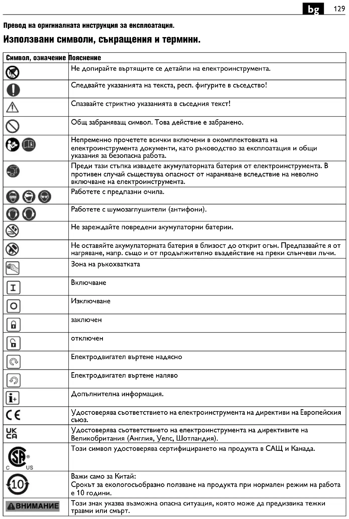 Удостоверява съответствието на електроинструмента на директивите на Великобритания (Англия, Уелс, Шотландия). Този символ удостоверява сертифицирането на продукта в САЩ и Канада. Важи само за Китай: Срокът за екологосъобразно ползване на продукта при нормален режим на работа е 10 години. Този знак указва възможна опасна ситуация, която може да предизвика тежки травми или смърт.130