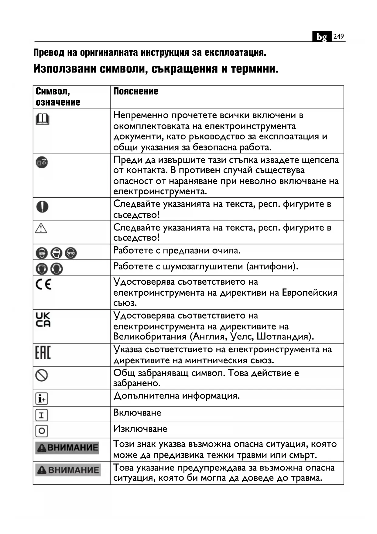 Превод на оригиналната инструкция за експлоатация. Използвани символи, съкращения и термини.