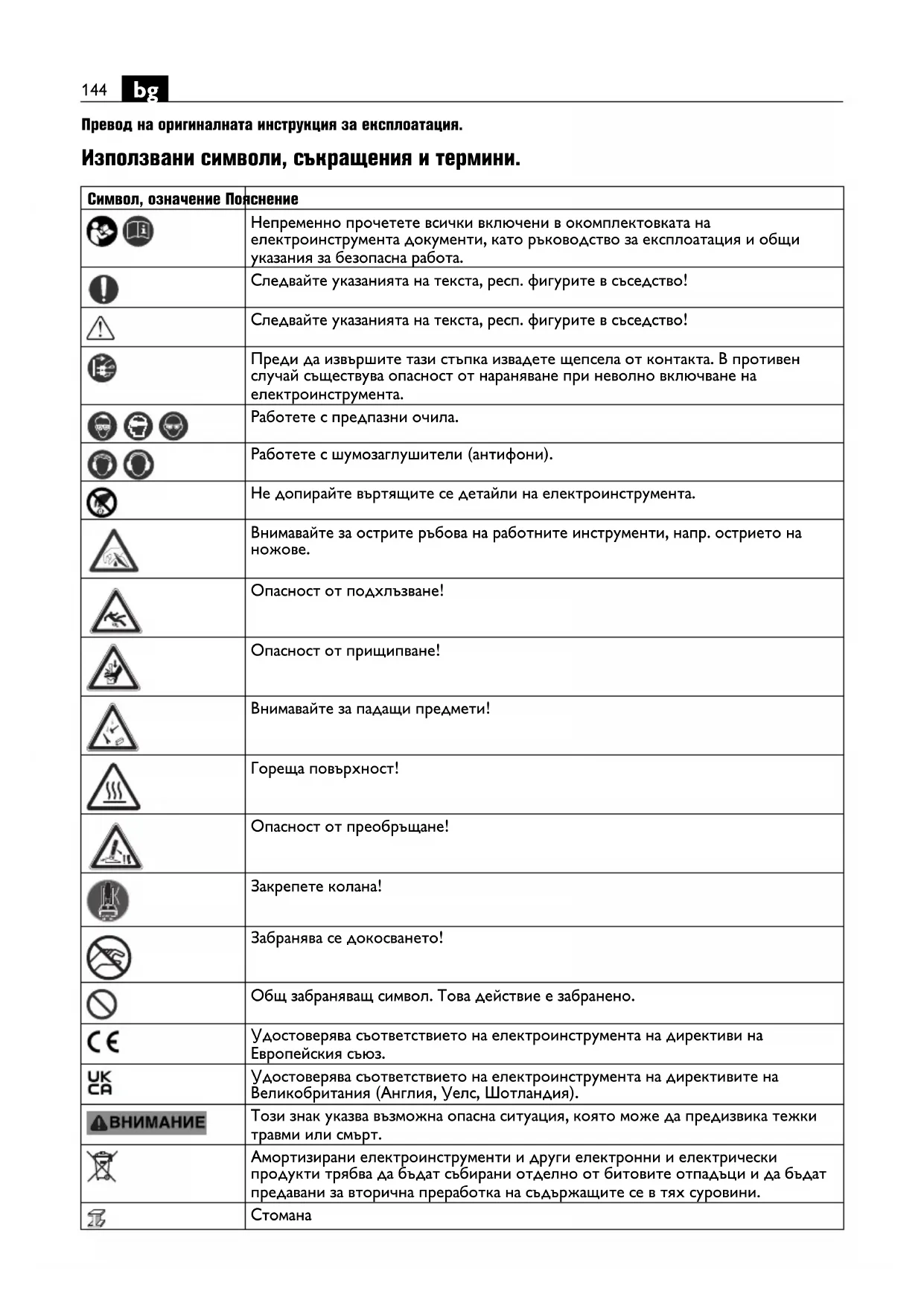 Опасност от подхлъзване! Опасност от прищипване! Внимавайте за падащи предмети! Гореща повърхност! Опасност от преобръщане! Закрепете колана! Забранява се докосването! Общ забраняващ символ. Това действие е забранено. Удостоверява съответствието на електроинструмента на директиви на Европейския съюз. Удостоверява съответствието на електроинструмента на директивите на Великобритания (Англия, Уелс, Шотландия). Този знак указва възможна опасна ситуация, която може да предизвика тежки травми или смърт. Амортизирани електроинструменти и други електронни и електрически продукти трябва да бъдат събирани отделно от битовите отпадъци и да бъдат предавани за вторична преработка на съд ържащите се в тях суровини. Стомана145