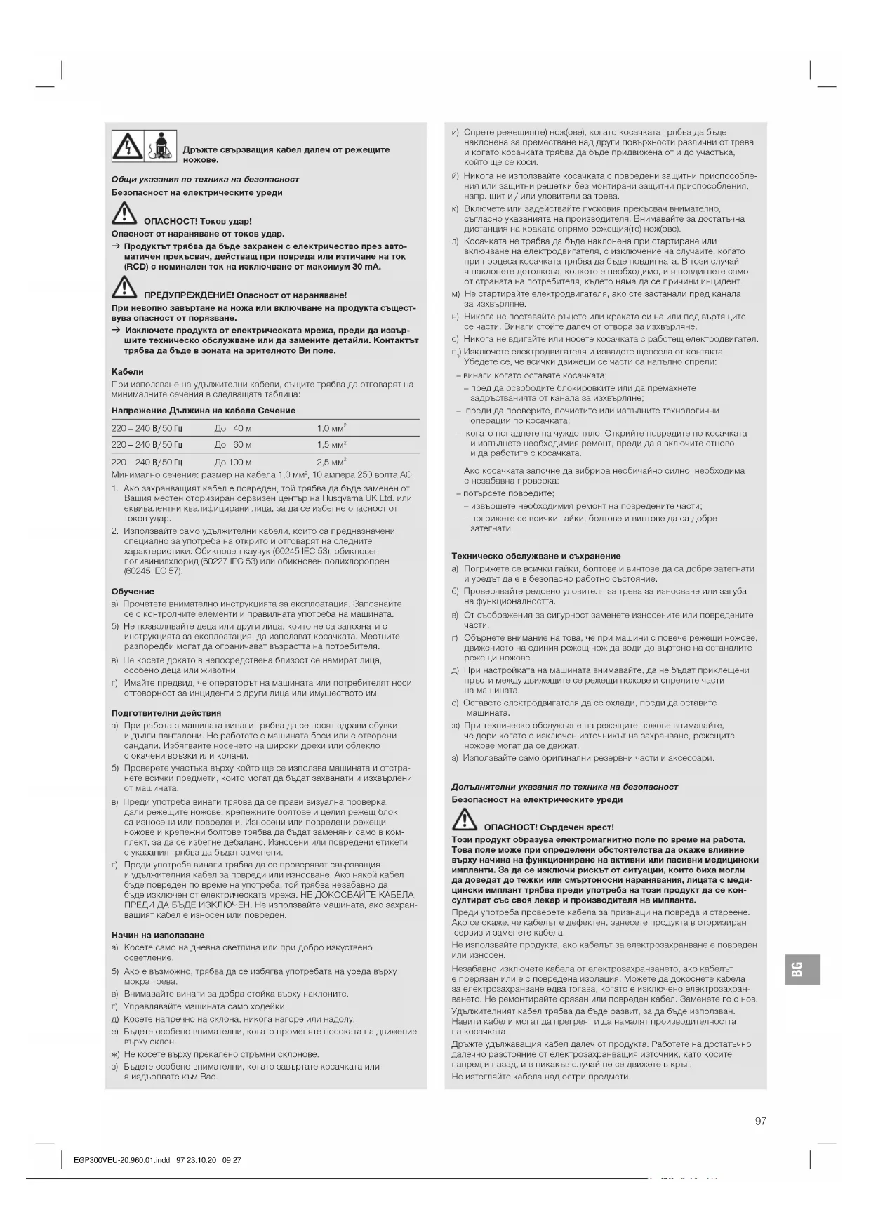 ж) При техническо обслужване на режещите ножове внимавайте, че дори когато е изключен източникът на захранване, режещите ножове могат да се движат. з) Използвайте само оригинални резервни части и аксесоари. Допълнителни указания по техника на безопасност Безопасност на електрическите уреди ОПАСНОСТ! Сърдечен арест! Този продукт образува електромагнитно поле по време на работа. Това поле може при определени обстоятелства да окаже влияние върху начина на функциониране на активни или пасивни медицински импланти. За да се изключи рискът от ситуации, които биха могли дадоведат до тежки или смъртоносни наранявания, лицата с меди- цински имплант трябва преди употреба на този продукт да се кон- султират със своя лекар и производителя на импланта. Преди употреба проверете кабела за признаци на повреда и стареене. Ако се окаже, че кабелът едефектен, занесете продукта в оторизиран сервиз и заменете кабела. Не използвайте продукта, ако кабелът за електрозахранване е повреден или износен. Незабавно изключете кабела от електрозахранването, ако кабелът е прерязан или е с повредена изолация. Можете да докоснете кабела за електрозахранване едва тогава, когато е изключено електрозахран- ването. Не ремонтирайте срязан или повреден кабел. Заменете го с нов. Удължителният кабел трябва да бъде развит, за да бъде използван. Навити кабели могат да прегреят и да намалят производителността на косачката. Дръжте удължаващия кабел далеч от продукта. Работете на достатъчно далечно разстояние от електрозахранващия източник, като косите напред и назад, и в никакъв случай не се движете в кръг. Не изтегляйте кабела над остри предмети. EGP300VEU-20.960.01.indd 97 23.10.20 09:27BG