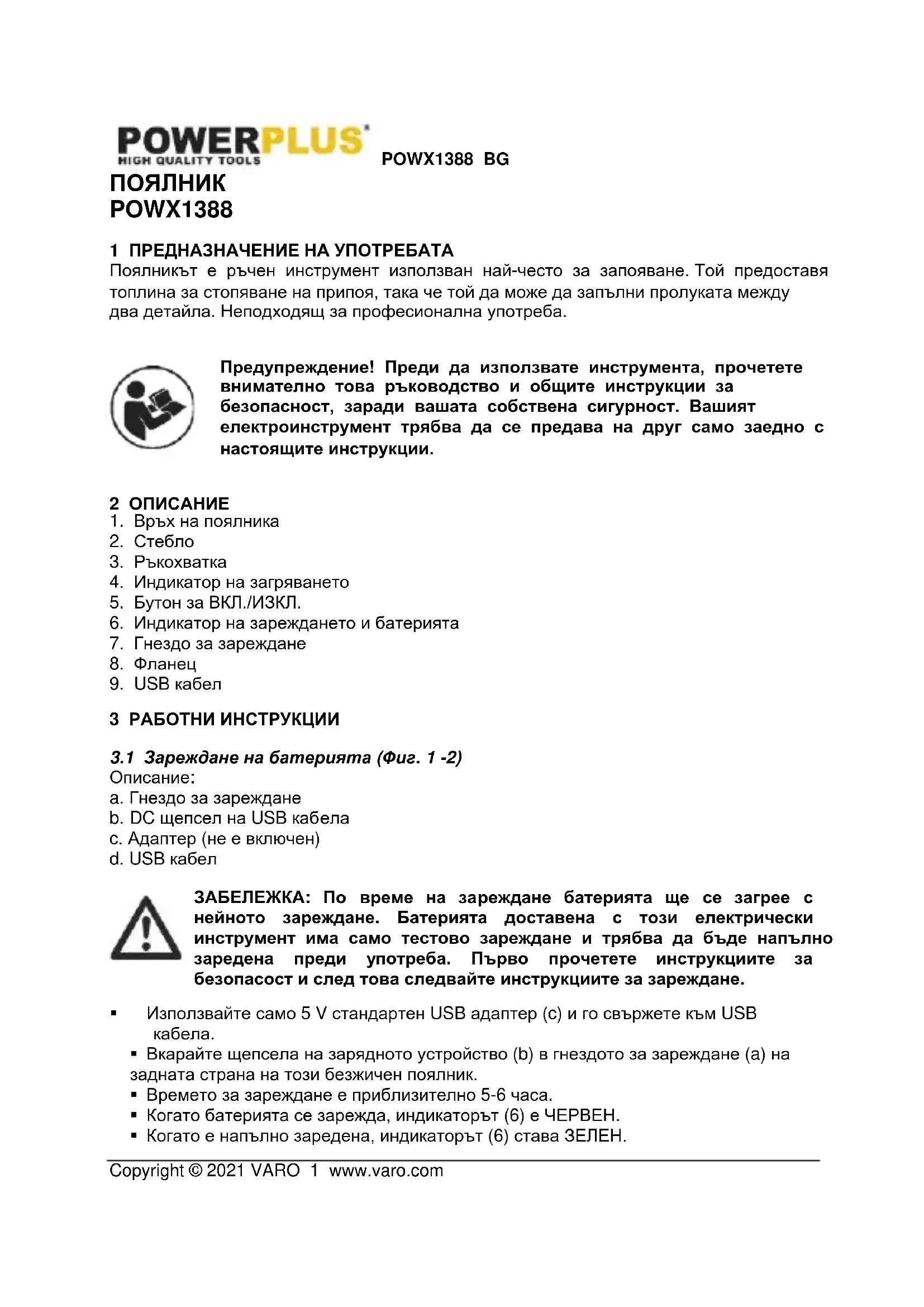 - Когато е напълно заредена, индикаторът (6) става ЗЕЛЕН.POWX1388 BG Copyright © 2021 VARO 2 www.varo.com ЗАБЕЛЕЖКА: Не допускайте кабела да се завърже на възел или да се