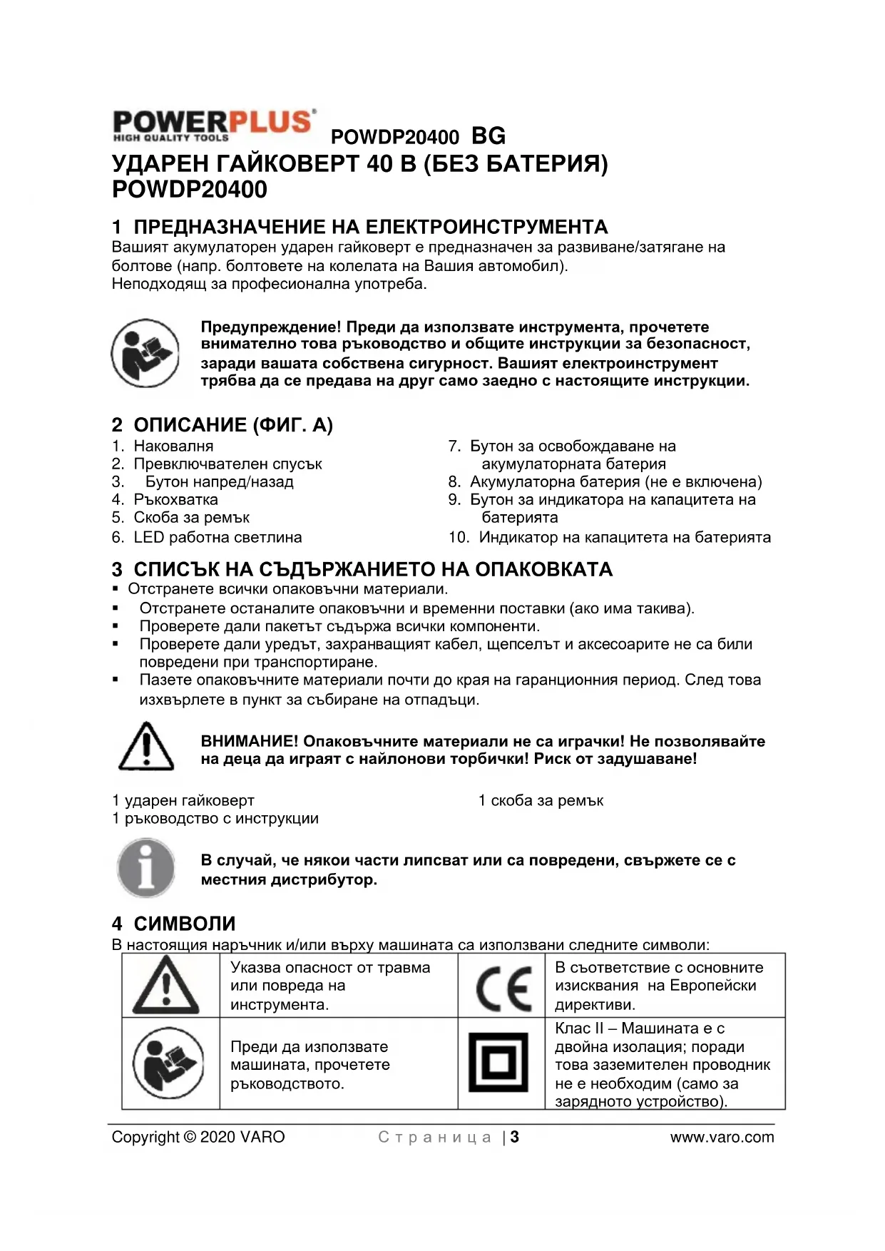 - Вашият инструмент трябва да бъде зареждан най-малко веднъж месечно за осигуряване на оптималната му работа. 15 ОКОЛНА СРЕДА Когато уредът ви трябва да бъде заменен след продължителна употреба, не го изхвърляйте с домакинските отпадъци, а по начин съобразен с опазването на околната среда. Отпадъците от електрически продукти не трябва да бъдат изхвърляни заедно с домакинските отпадъци. Моля, проучете къде има възможности за рециклиране. Поискайте от местните власти или от продавача съвети относно рециклирането.POWDP20400 BG Copyright © 2020 VARO С т р а н и ц а | 15 www.varo.com 16 ДЕКЛАРАЦИЯ ЗА СЪОТВЕТСТВИЕ VARO – Vic. Van Rompuy N.V. – Joseph Van Instraat 9 – BE2500 Lier – Белгия декларират, че продукт: Акумулаторен ударен гайковерт 40 В – работещ с батерия марка: PowerPlus модел: POWDP20400 е в съответствие с основните изисквания и други съответни разпоредби на приложимите Европейски директиви, базирани върху прилагането на Европейските хармонизирани стандарти. Всяка неупълномощена модификация на апарата анулира тази декларация. Европейски директиви (включително техните промени към датата на подписване, ако са приложими): 2011/65/EU 2006/42/EC 2014/30/EU Европейски хармонизирани стандарти (включително техните промени към датата на подписване, ако са приложими): EN62841-1 : 2015 EN62841-2-2 : 2014 EN55014-1 : 2017 EN55014-2 : 2015 Съхранител на техническата документация: Филип Ванкеркхов, VARO – Vic. Van Rompuy N.V. Долуподписаният действа от името на Изпълнителния директор на компанията, Ludo Mertens Регулационни въпроси – мениджър по съответствията 08/06/2020, Lier - BelgiumWWW.VARO.COM