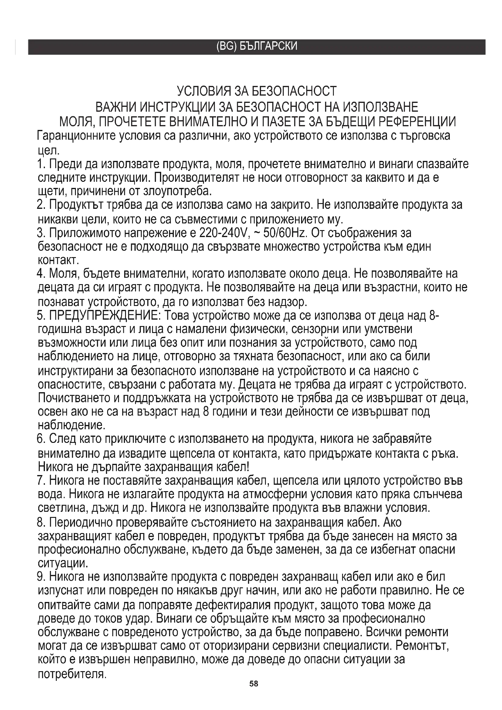 следните инструкции. Производителят не носи отговорност за каквито и да е щети, причинени от злоупотреба. ВАЖНИ ИНСТРУКЦИИ ЗА БЕЗОПАСНОСТ НА ИЗПОЛЗВАНЕ