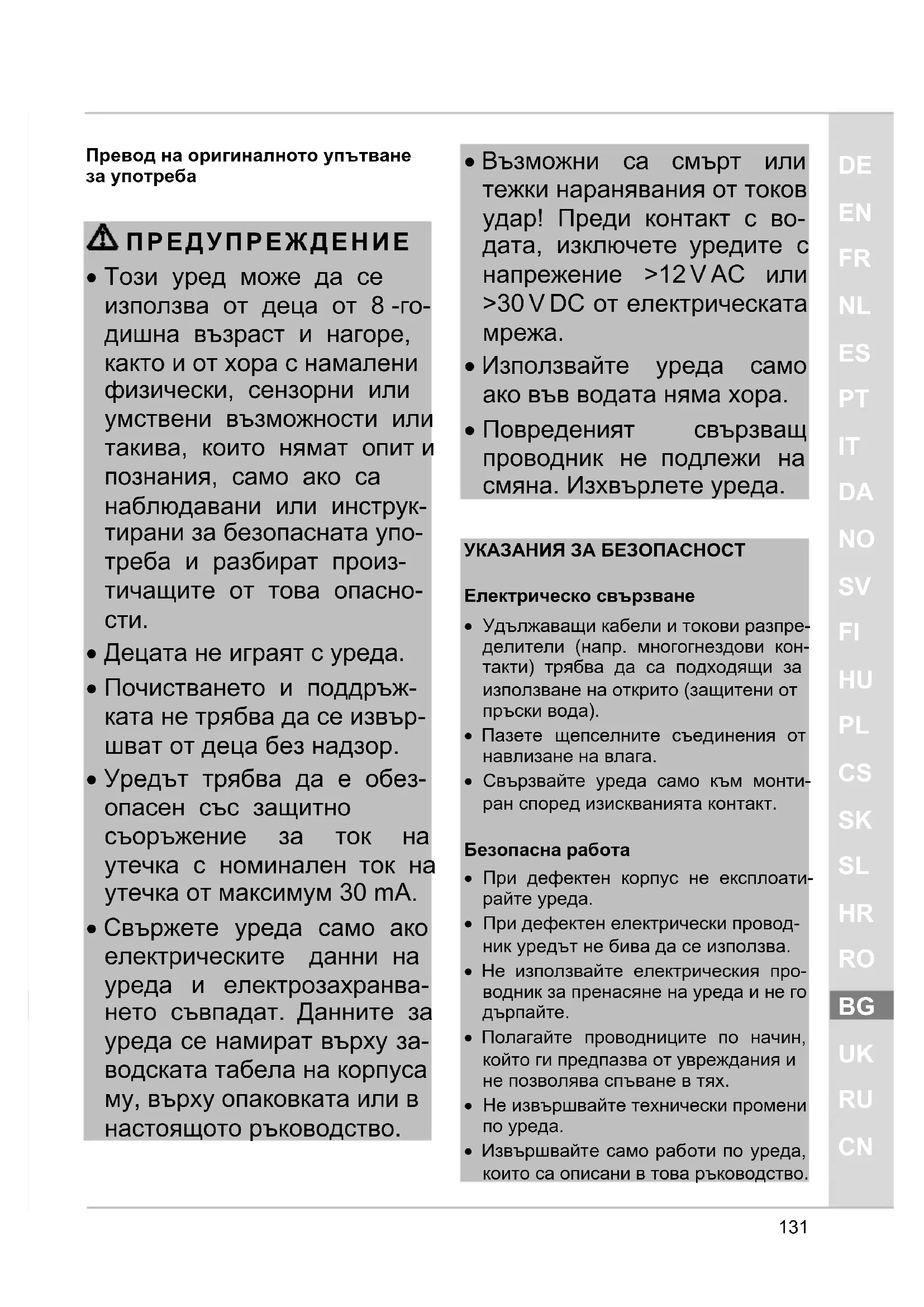 - Възможни са смърт или тежки наранявания от токов удар! Преди контакт с во- дата, изключете уредите с напрежение >12 V AC или >30 V DC от електрическата