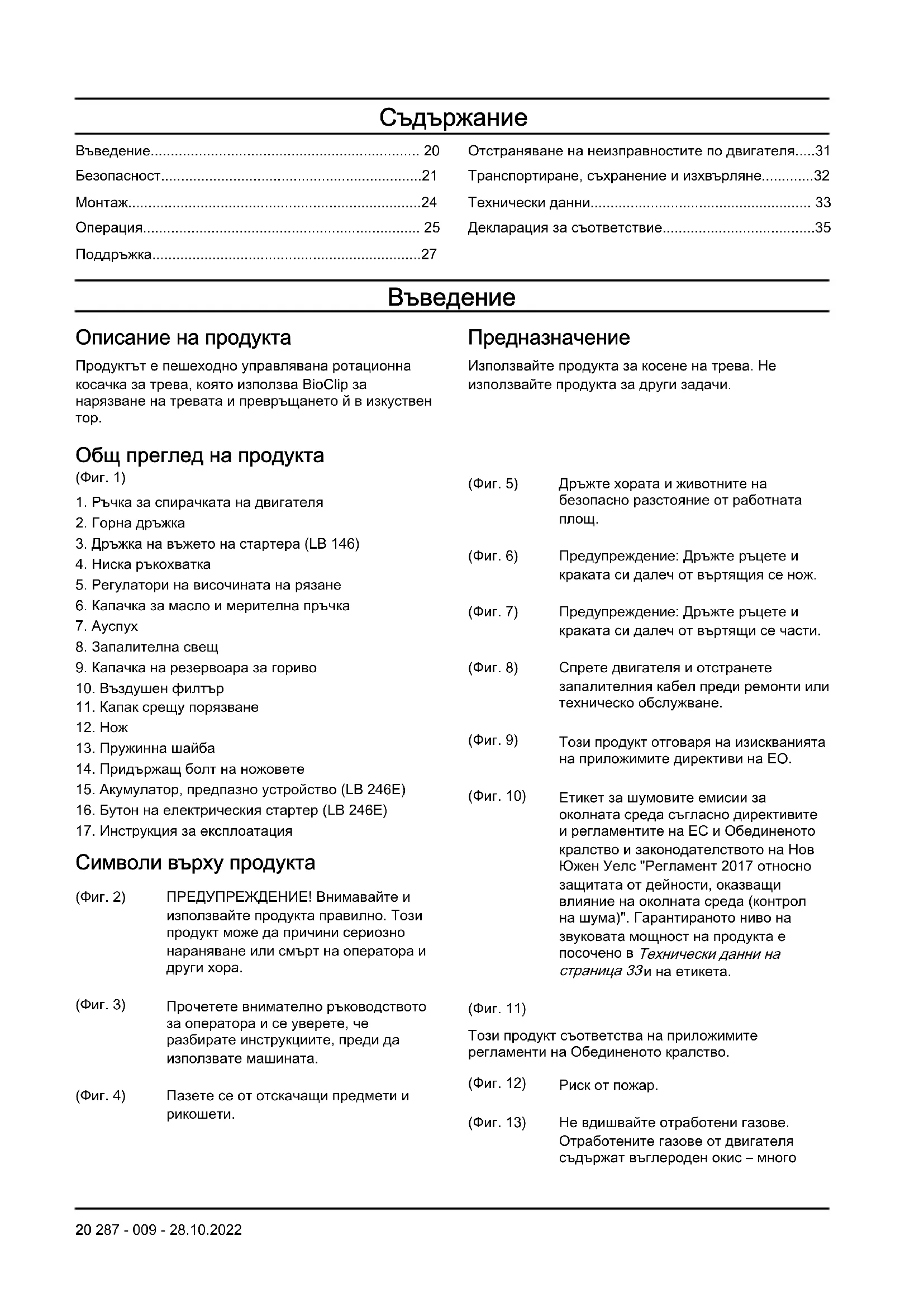 Технически данни на страница 33 и на етикета. (Фиг. 11) Този продукт съответства на приложимите регламенти на Обединеното кралство. (Фиг. 12) Риск от пожар. (Фиг. 13) Не вдишвайте отработени газове. Отработените газове от двигателя съдържат въглероден окис – много 20 287 - 009 - 28.10.2022опасен отровен газ без миризма. Не стартирайте двигателя на закрито или в затворени пространства. (Фиг. 14) Гореща повърхност. (Фиг. 16) Преди да стартирате про- дукта, напълнете двигателя