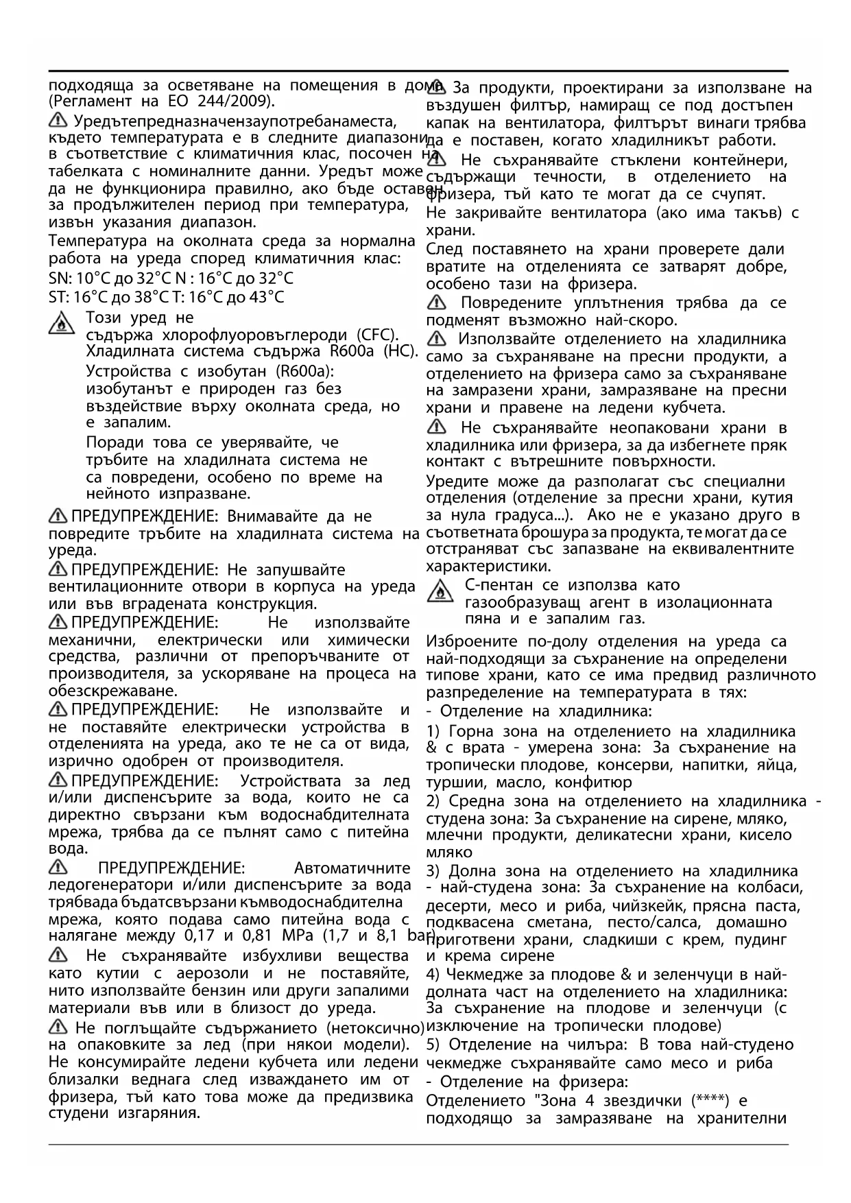 ПРЕДУПРЕЖДЕНИЕ: Не запушвайте вентилационните отвори в корпуса на уреда или във вградената конструкция. ПРЕДУПРЕЖДЕНИЕ: Не използвайте механични, електрически или химически средства, различни от препоръчваните от производителя, за ускоряване на процеса на обезскрежаване. ПРЕДУПРЕЖДЕНИЕ: Не използвайте и не поставяйте електрически устройства в отделенията на уреда, ако те не са от вида, изрично одобрен от производителя. ПРЕДУПРЕЖДЕНИЕ: Устройствата за лед и/или диспенсърите за вода, които не са директно свързани към водоснабдителната мрежа, трябва да се пълнят само с питейна