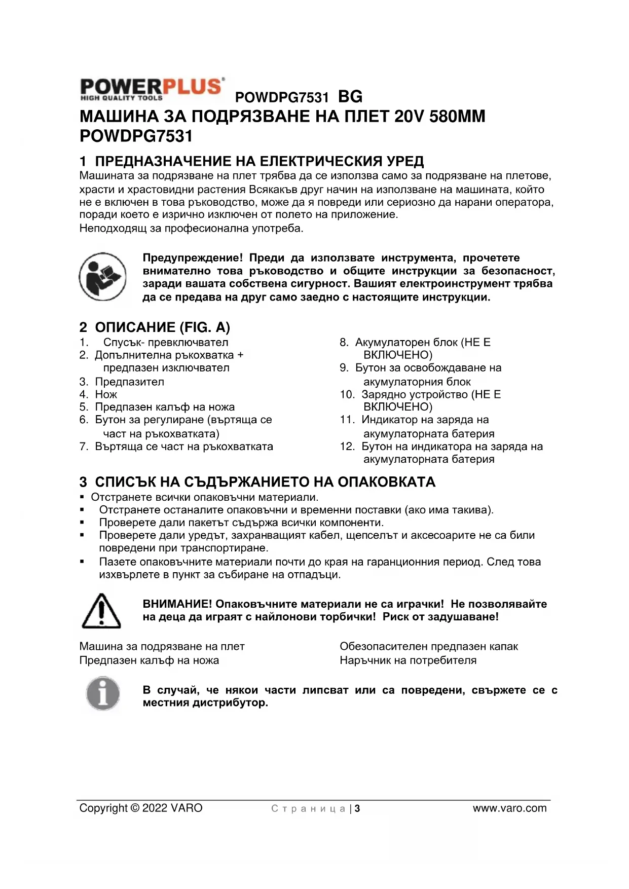 - POWDPG7531 BG Copyright © 2022 VARO С т р а н и ц а | 2 www.varo.com 15 ДЕКЛАРАЦИЯ ЗА СЪОТВЕТСТВИЕ POWDPG7531 BG Copyright © 2022 VARO С т р а н и ц а | 3 www.varo.com МАШИНА ЗА ПОДРЯЗВАНЕ НА ПЛЕТ 20V 580MM POWDPG7531 1 ПРЕДНАЗНАЧЕНИЕ НА ЕЛЕКТРИЧЕСКИЯ УРЕД Машината за подрязване на плет трябва да се използва само за подрязване на плетове, храсти и храстовидни растения Всякакъв друг начин на използване на машината, който не е включен в това ръководство, може да я повреди или сериозно да нарани оператора, поради което е изрично изключен от полето на приложение. Неподходящ за професионална употреба. Предупреждение! Преди да използвате инструмента, прочетете внимателно това ръководство и общите инструкции за безопасност, заради вашата собствена сигурност. Вашият електроинструмент трябва да се предава на друг само заедно с настоящите инструкции. 2 ОПИСАНИЕ (FIG. A) p. 12