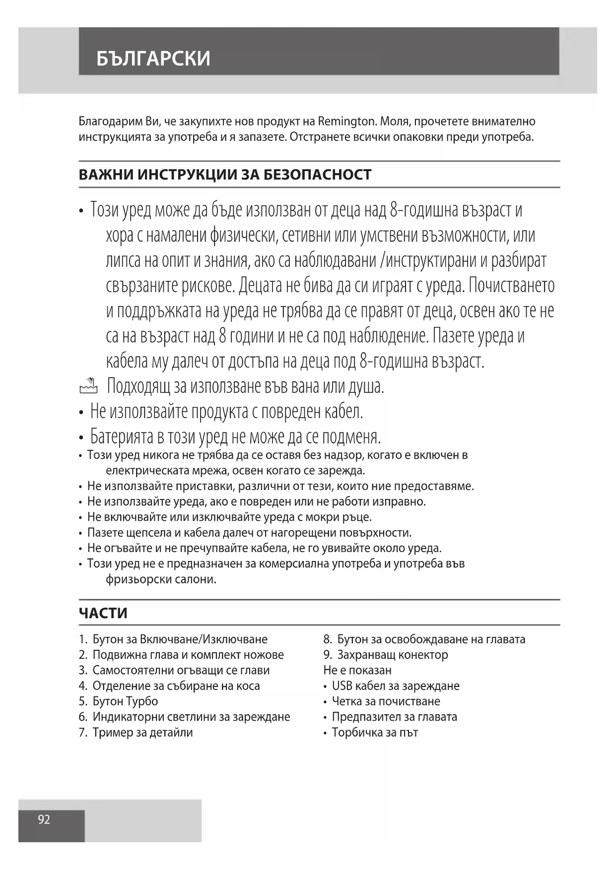AE92 Благодарим Ви, че закупихте нов продукт на Remington. Моля, прочетете внимателно инструкцията за употреба и я запазете. Отстранете всички опаковки преди употреба. ВАЖНИ ИНСТРУКЦИИ ЗА БЕЗОПАСНОСТ