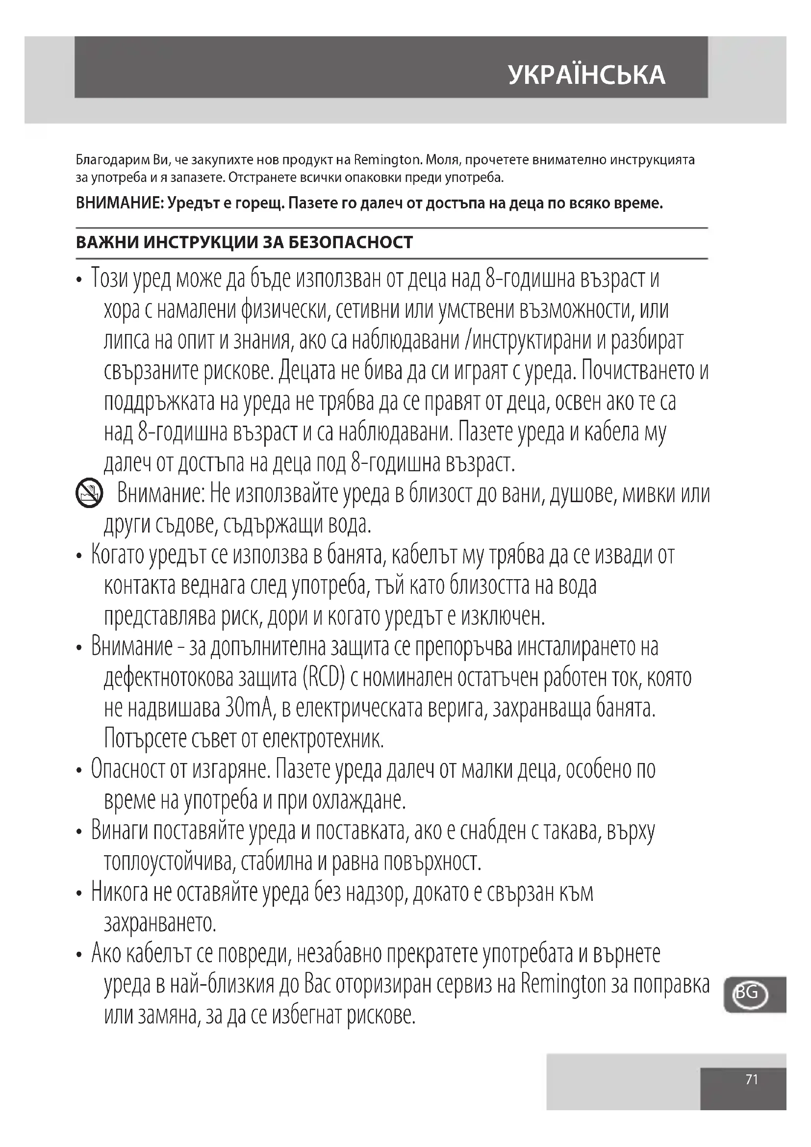 Благодарим Ви, че закупихте нов продукт на Remington. Моля, прочетете внимателно инструкцията за употреба и я запазете. Отстранете всички опаковки преди употреба. ВНИМАНИЕ: Уредът е горещ. Пазете го далеч от достъпа на деца по всяко време. ВАЖНИ ИНСТРУКЦИИ ЗА БЕЗОПАСНОСТ