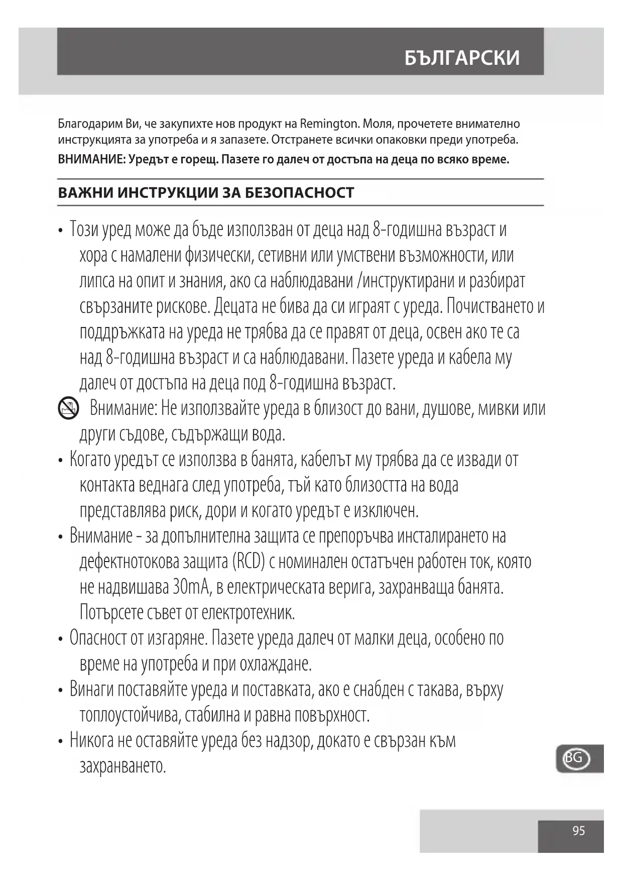 Благодарим Ви, че закупихте нов продукт на Remington. Моля, прочетете внимателно инструкцията за употреба и я запазете. Отстранете всички опаковки преди употреба. ВНИМАНИЕ: Уредът е горещ. Пазете го далеч от достъпа на деца по всяко време. ВАЖНИ ИНСТРУКЦИИ ЗА БЕЗОПАСНОСТ