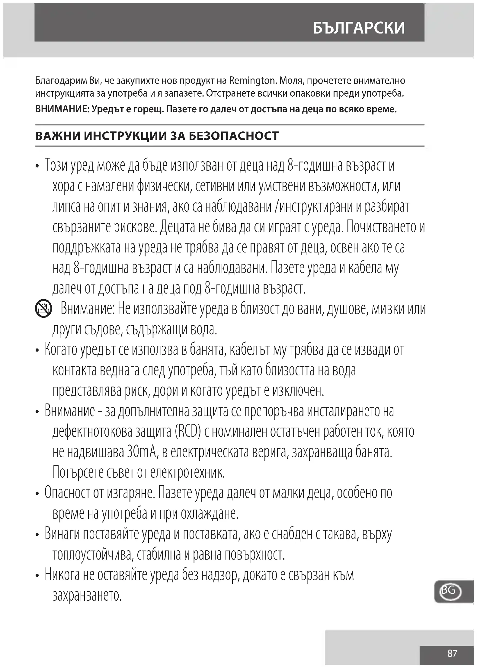 - Ако кабелът се повреди, незабавно прекратете употребата и върнете уреда в най-близкия до Вас оторизиран сервиз на Remington за поправка или замяна, за да се избегнат рискове.