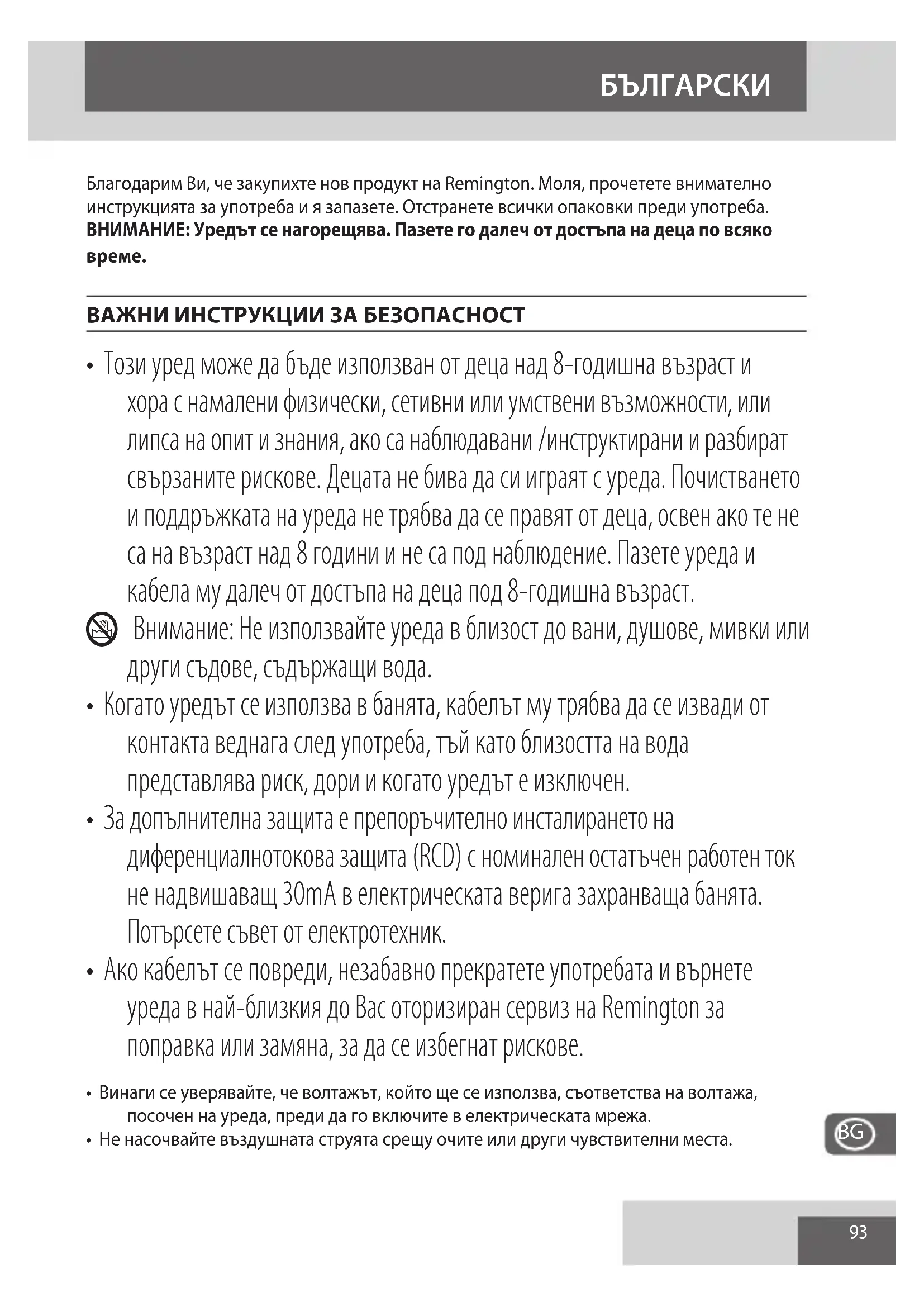 - Ако кабелът се повреди, незабавно прекратете употребата и върнете уреда в най-близкия до Вас оторизиран сервиз на Remington за поправка или замяна, за да се избегнат рискове.