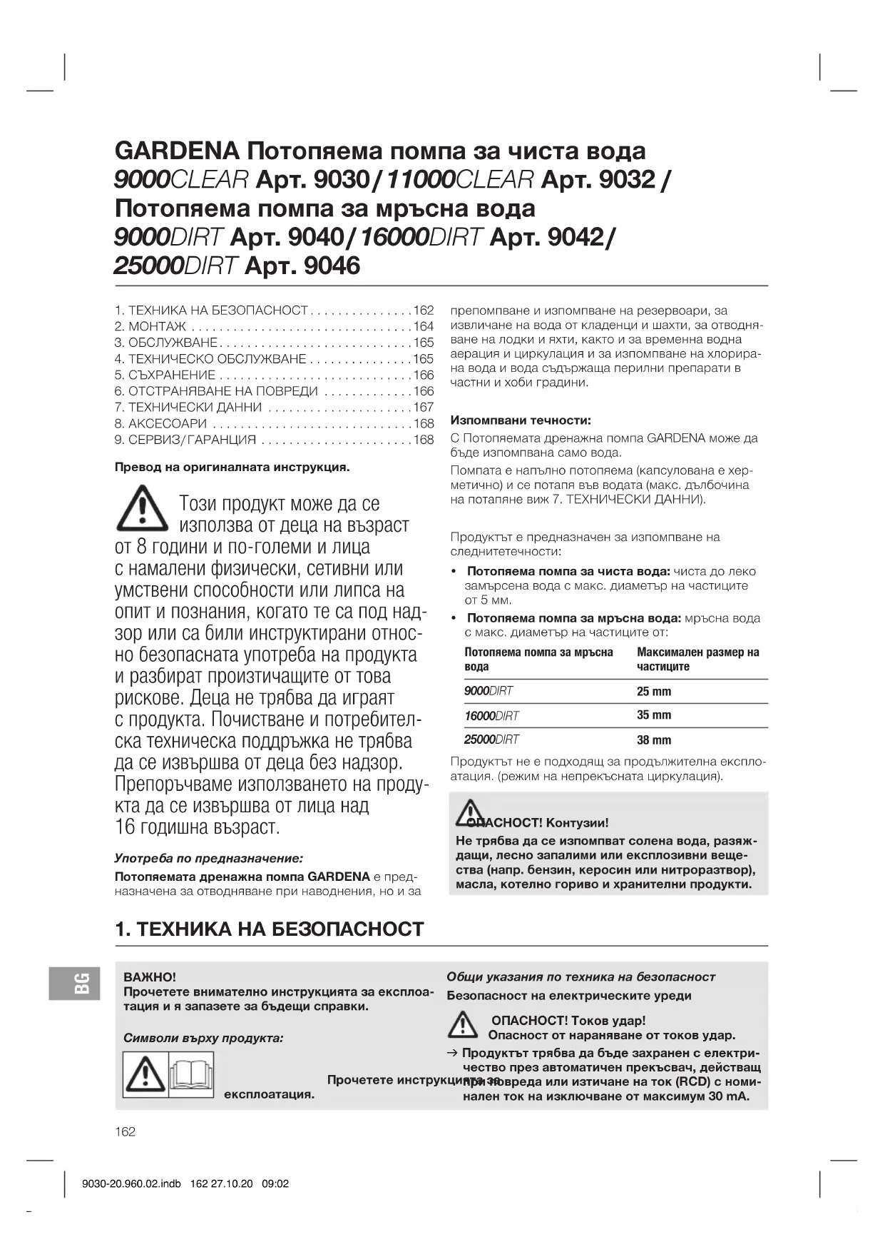 Прочетете внимателно инструкцията за експлоа- тация и я запазете за бъдещи справки. Символи върху продукта: Прочетете инструкцията за експлоатация. Общи указания по техника на безопасност Безопасност на електрическите уреди ОПАСНОСТ! Токов удар! Опасност от нараняване от токов удар. v Продуктът трябва да бъде захранен с електри- чество през автоматичен прекъсвач, действащ при повреда или изтичане на ток (RCD) с номи- нален ток на изключване от максимум 30 mA. GARDENA Потопяема помпа за чиста вода 9000CLEAR Арт. 9030 / 11000CLEAR Арт. 9032 / Потопяема помпа за мръсна вода 9000DIRT Арт. 9040 / 16000DIRT Арт. 9042 / 25000DIRT Арт. 9046