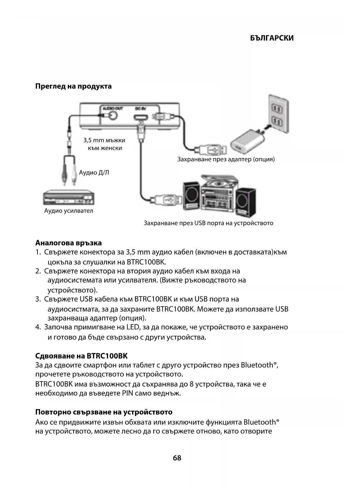 Отстраняване на неизправности Ако не чувате звук от говорителите, проверете следното: - уверете се, че BTRC100BK е свързан към захранването; - уверете се, че аудиокабелът е правилно свързан към BTRC100BK; - уверете се, че силата на звука е установена правилно; - уверете се, че устройствата са на максимално разстояние до 10метра от аудио предавателя; - уверете се, че функцията Bluetooth® на устройството е активирана; - уверете се, че на устройството се възпроизвежда музика.70
