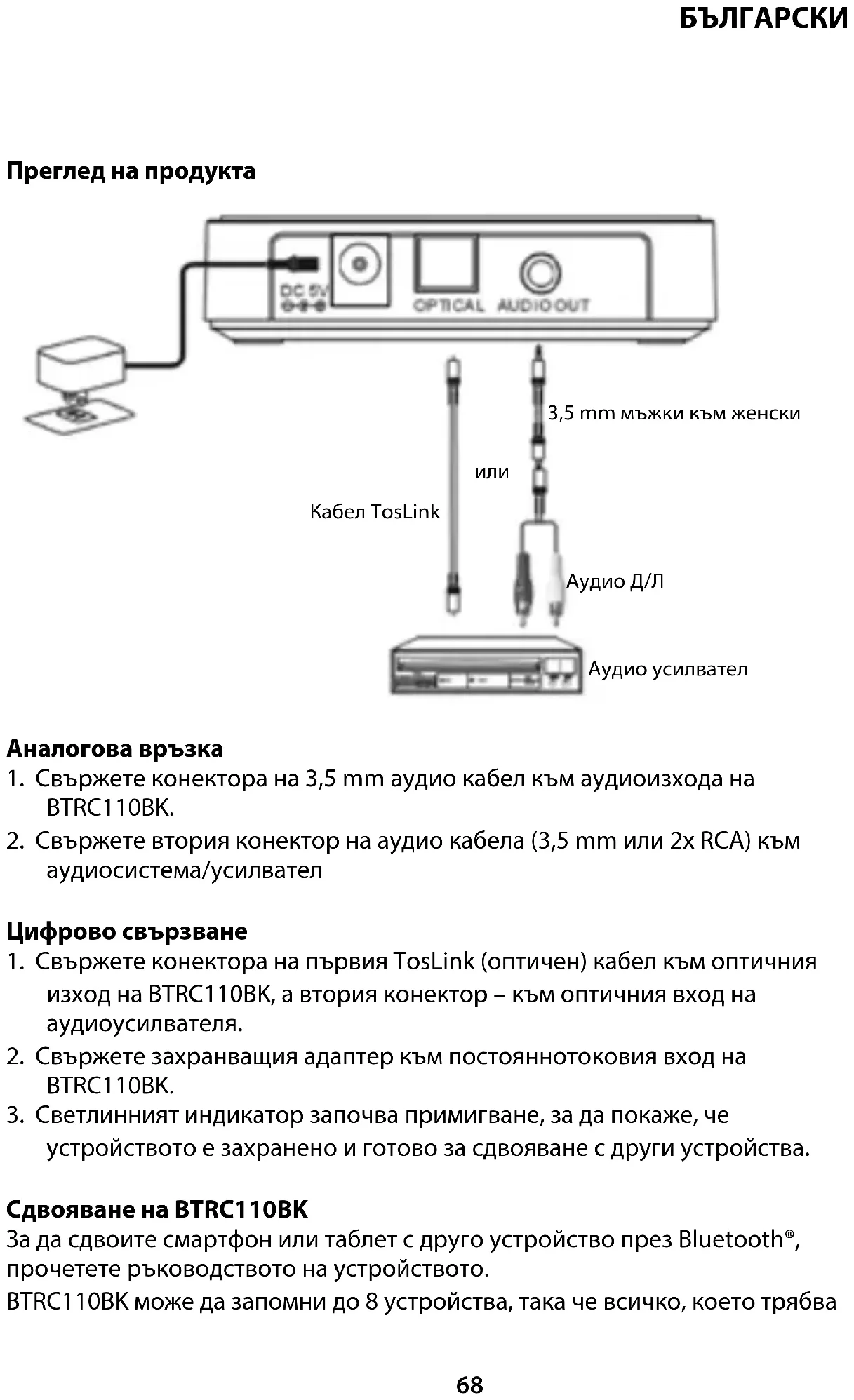 изход на BTRC110BK, а втория конектор – към оптичния вход на аудиоусилвателя.
