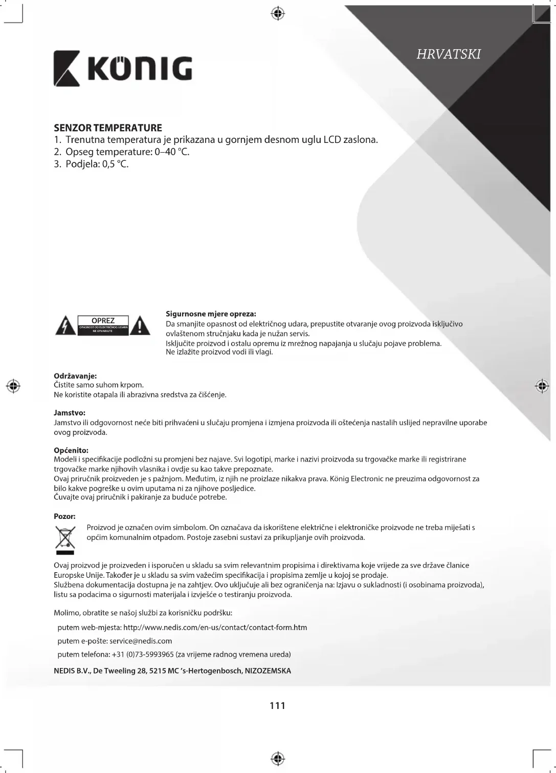 Продуктът е произведен и доставен в съответствие с всички приложими разпоредби и директиви, валидни за всички страни- членки на Европейския съюз. Освен това съответства на всички приложими спецификации и разпоредби в страните, в които се предлага. Можете да получите официалната документация при поискване. Тя включва, но не се ограничава до: Декларация за съответствие (и идентичност на продукта), паспорт за безопасност на веществата и доклад от тестовете на продукта. Свържете с с бюрото за обслужване на клиенти за допълнителна информация: чрез мрежата: http://www.nedis.com/en-us/contact/contact-form.htm чрез имейл: service@nedis.com по телефона: +31 (0)73-5993965 (през работно време) NEDIS B.V., De Tweeling 28, 5215 MC ’s-Hertogenbosch, ХОЛАНДИЯ117 POLSKI