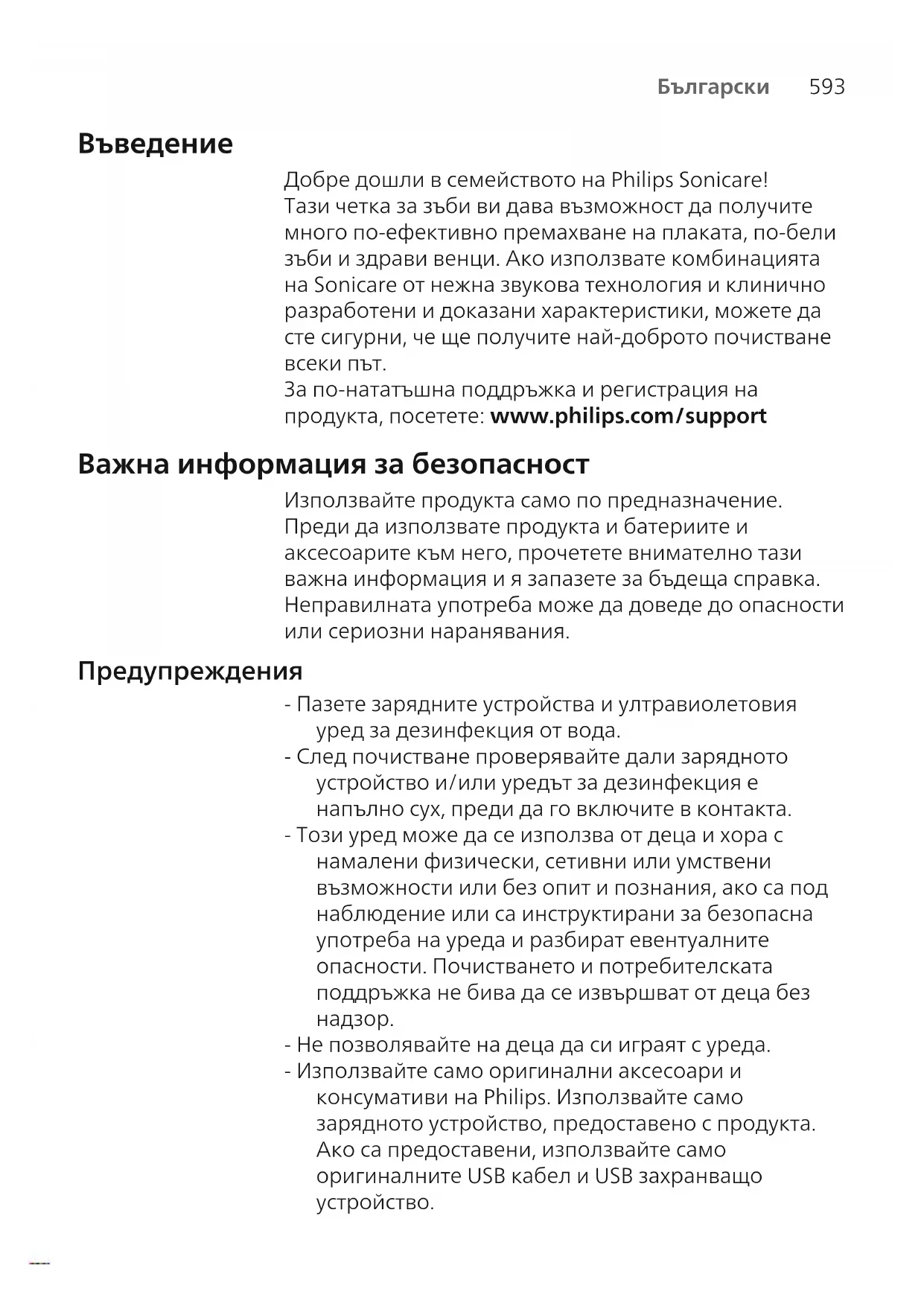 - Не позволявайте на деца да си играят с уреда. - Използвайте само оригинални аксесоари и консумативи на Philips. Използвайте само зарядното устройство, предоставено с продукта. Ако са предоставени, използвайте само оригиналните USB кабел и USB захранващо устройство.594