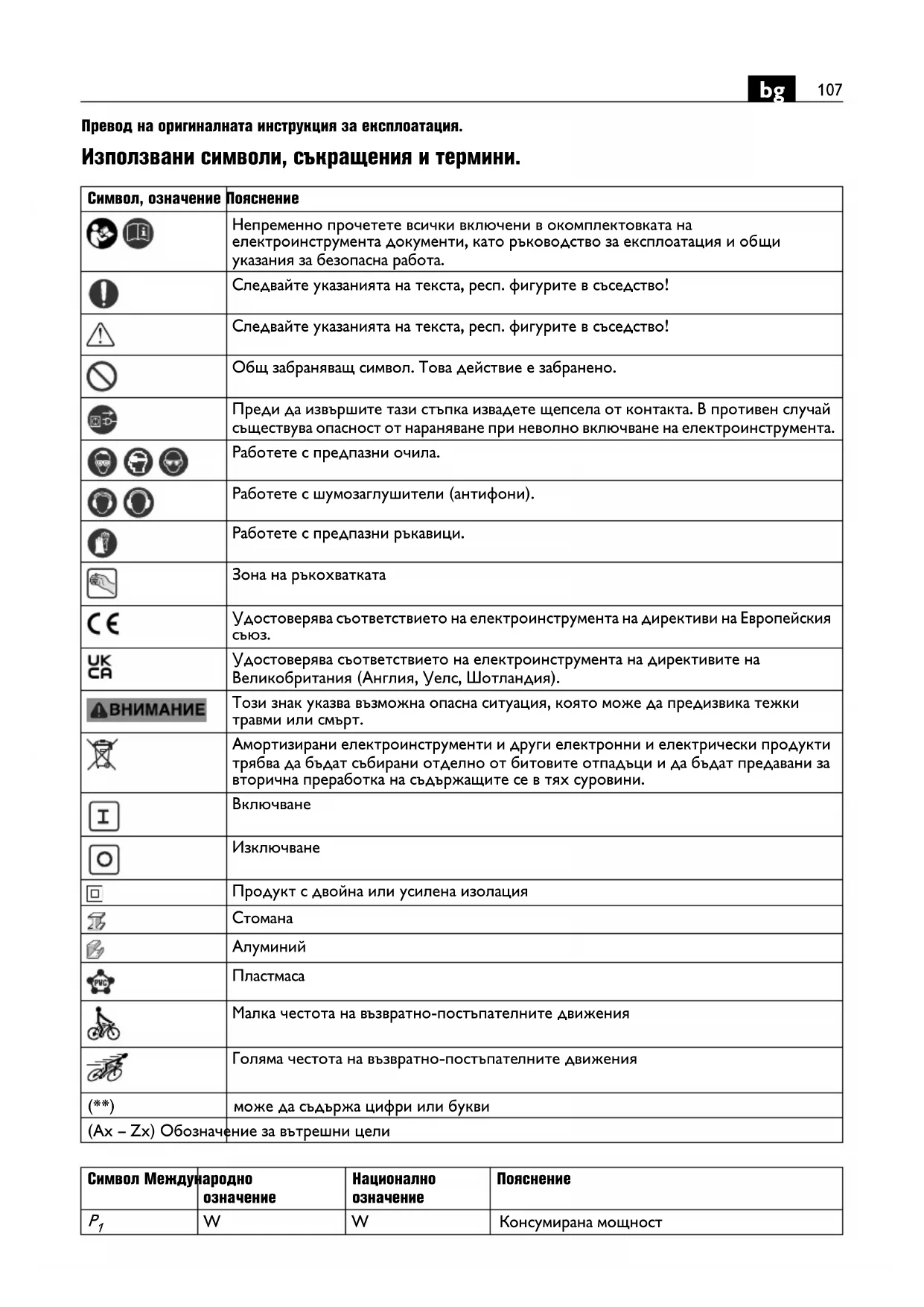 Превод на оригиналната инструкция за експлоатация. Използвани символи, съкращения и термини. Символ, означение Пояснение Непременно прочетете всички включени в окомплектовката на електроинструмента документи, като ръководство за експлоатация и общи указания за безопасна работа. Следвайте указанията на текста, респ. фигурите в съседство! Следвайте указанията на текста, респ. фигурите в съседство! Общ забраняващ символ. Това действие е забранено. Преди да извършите тази стъпка извадете щепсела от контакта. В противен случай съществува опасност от нараняване при неволно включване на електроинструмента. Работете с предпазни очила. Работете с шумозаглушители (антифони). Работете с предпазни ръкавици. Зона на ръкохватката Удостоверява съответствието на електроинструмента на директиви на Европейския