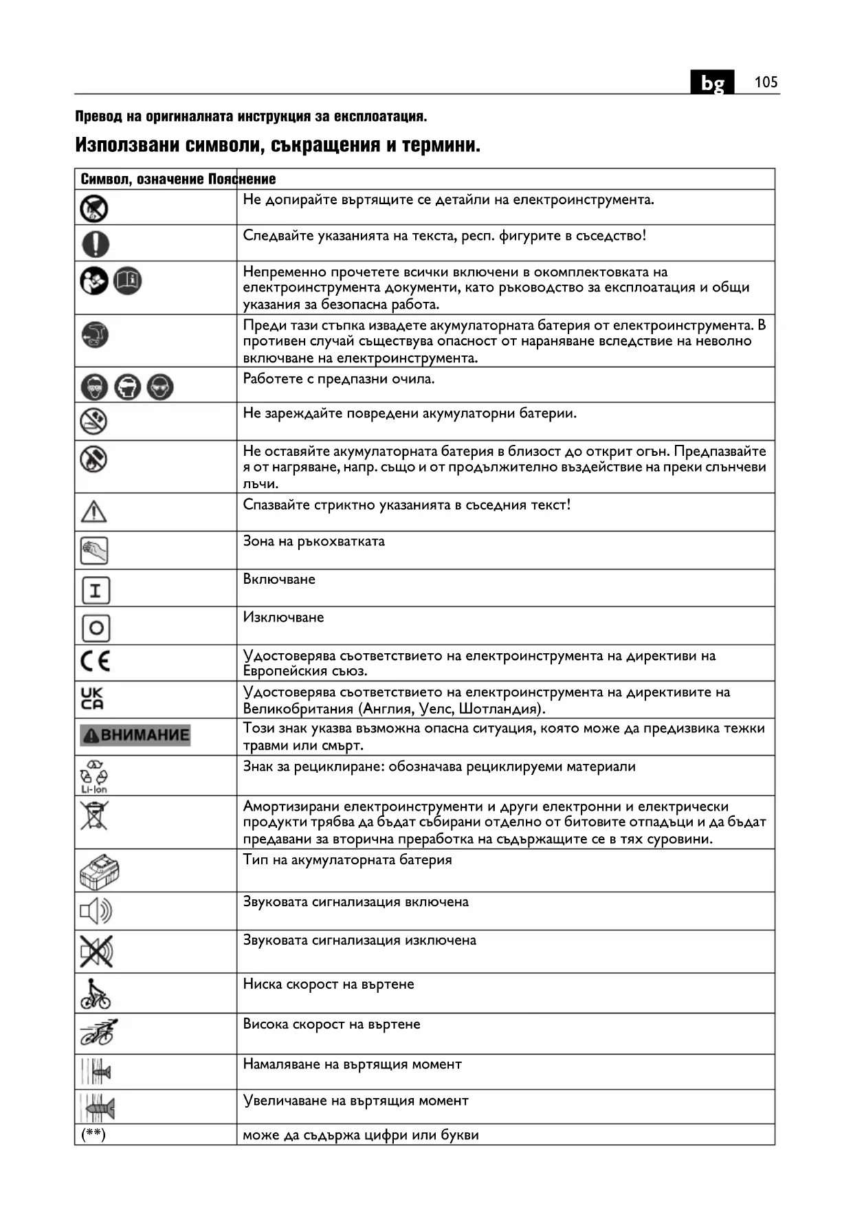 Удостоверява съответствието на електроинструмента на директиви на Европейския съюз. Удостоверява съответствието на електроинструмента на директивите на Великобритания (Англия, Уелс, Шотландия). Този знак указва възможна опасна ситуация, която може да предизвика тежки травми или смърт. Знак за рециклиране: обозначава рециклируеми материали Амортизирани електроинструменти и други електронни и електрически продукти трябва да бъдат събирани отделно от битовите отпадъци и да бъдат предавани за вторична преработка на съ държащите се в тях суровини. Тип на акумулаторната батерия Звуковата сигнализация включена Звуковата сигнализация изключена Ниска скорост на въртене Висока скорост на въртене Намаляване на въртящия момент Увеличаване на въртящия момент (**) може да съдържа цифри или букви106