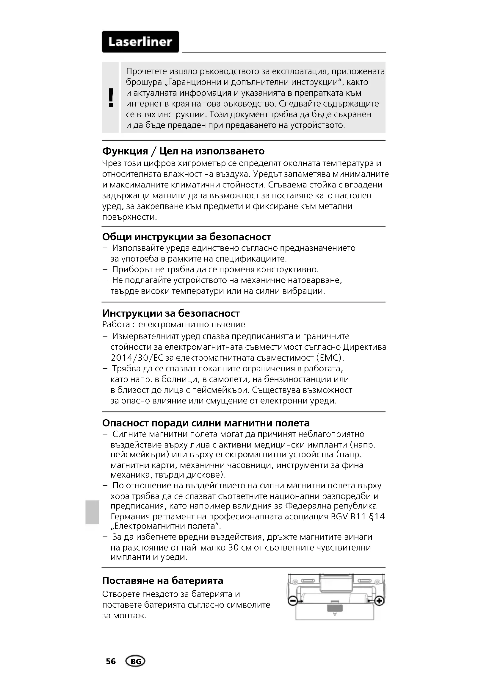 Инструкции за безопасност Работа с електромагнитно лъчение – Измервателният уред спазва предписанията и граничните стойности за електромагнитната съвместимост съгласно Директива 2014/30/EС за електромагнитната съвместимост (EMC). – Трябва да се спазват локалните ограничения в работата, като напр. в болници, в самолети, на бензиностанции или в близост до лица с пейсмейкъри. Съществува възможност за опасно влияние или смущение от електронни уреди. Общи инструкции за безопасност – Използвайте уреда единствено съгласно предназначението за употреба в рамките на спецификациите. – Приборът не трябва да се променя конструктивно. – Не подлагайте устройството на механично натоварване, твърде високи температури или на силни вибрации. Функция / Цел на използването Чрез този цифров хигрометър се определят околната температура и относителната влажност на въздуха. Уредът запаметява минималните и максималните климатични стойности. Сгъваема стойка с вградени задържащи магнити дава възможност за поставяне като настолен уред, за закрепване към предмети и фиксиране към метални повърхности. Прочетете изцяло ръководството за експлоатация, приложената брошура „Гаранционни и допълнителни инструкции“, както и актуалната информация и указанията в препратката към интернет в края на това ръководство. Следвайте съдържащите се в тях инструкции. Този документ трябва да бъде съхранен и да бъде предаден при предаването на устройството.