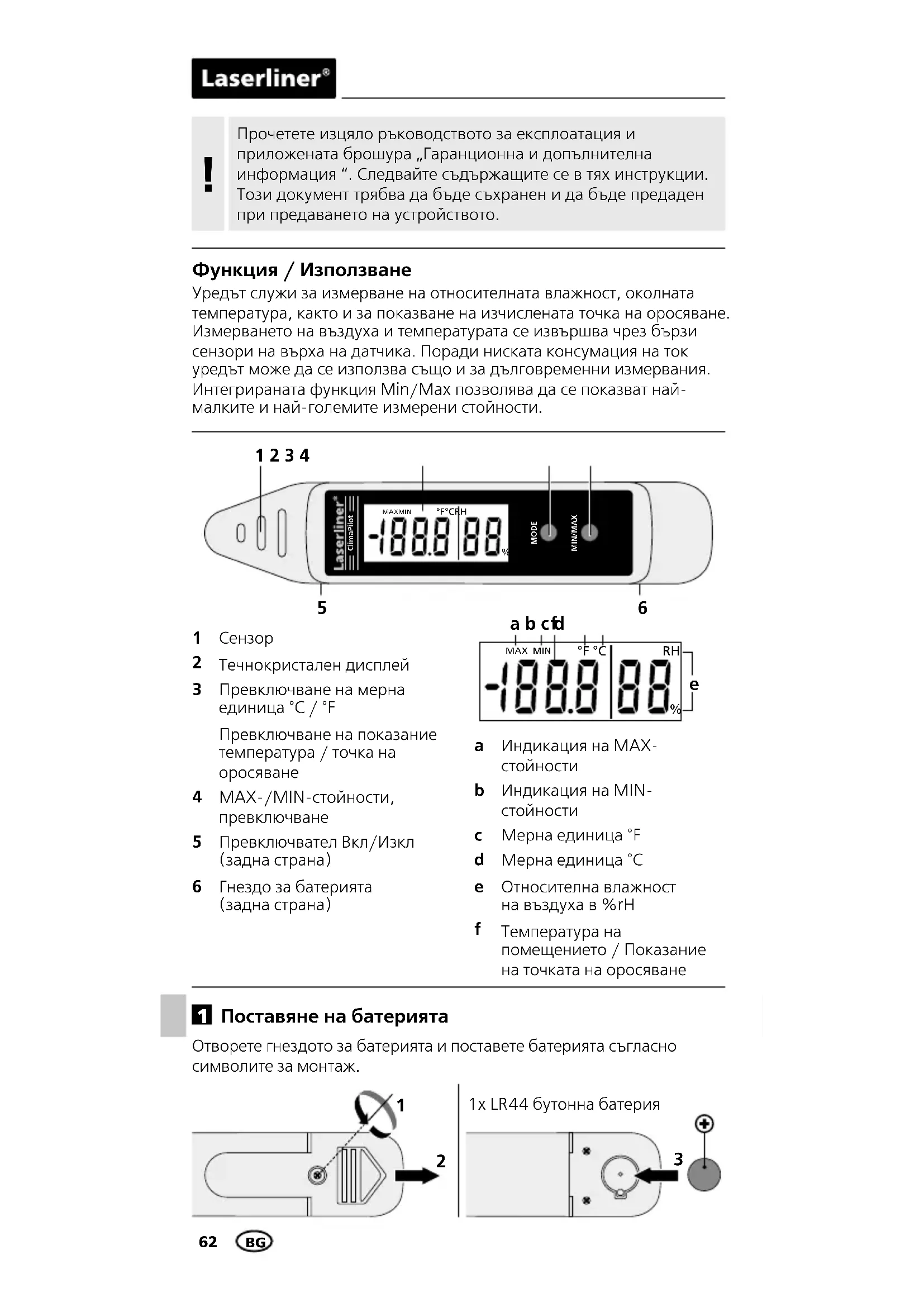 Поставяне на батерията Отворете гнездото за батерията и поставете батерията съгласно символите за монтаж. 1x LR44 бутонна батерия BGClimaPilot