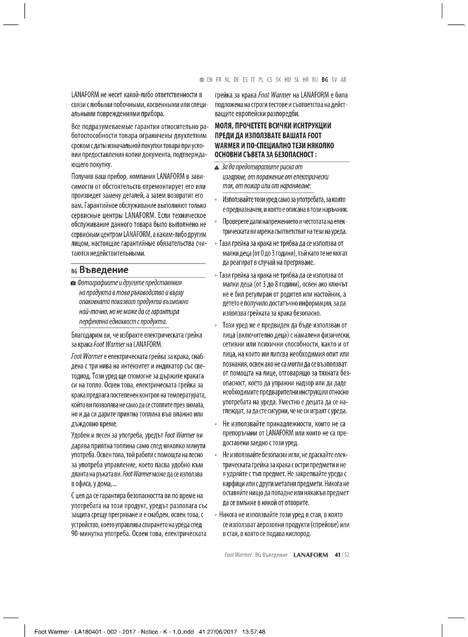 - Никога не използвайте този уред в стая, в която се използват аерозолни продукти (спрейове) или в стая, в която се подава кислород. Foot Warmer - LA180401 - 002 - 2017 - Notice - K - 1.0.indd 41 27/06/2017 13:57:4842 / 52 Foot Warmer BG Въведение EN FR NL DE ES IT PL CS SK HU SL HR RU BG SV AR