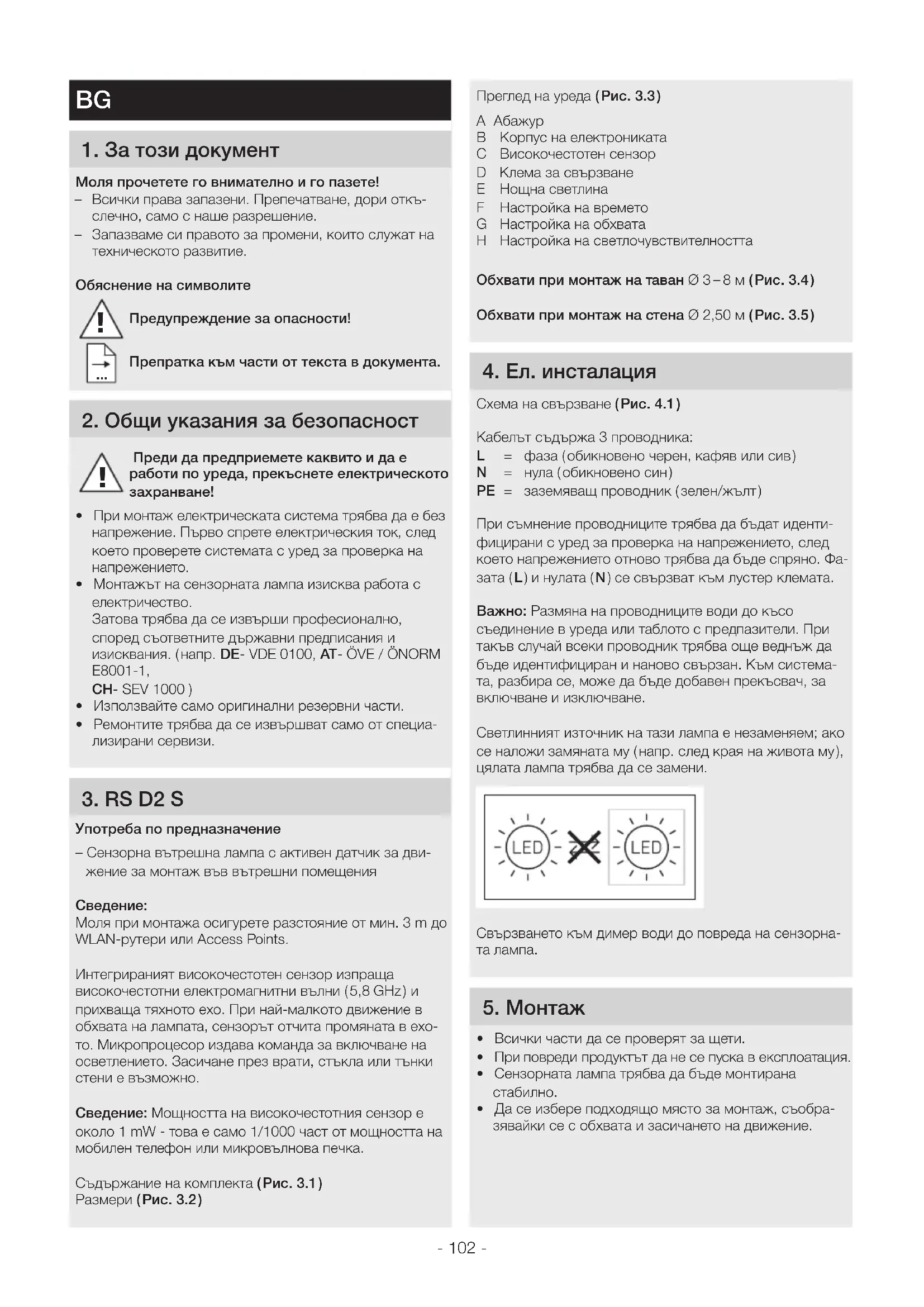 - Ремонтите трябва да се извършват само от специа- лизирани сервизи. 3 RS D2 S Употреба по предназначение – Сензорна вътрешна лампа с активен датчик за дви- жение за монтаж във вътрешни помещения Моля при монтажа осигурете разстояние от мин. 3 m до WLAN-рутери или Access Points. Интегрираният високочестотен сензор изпраща високочестотни електромагнитни вълни ( 5,8 GHz ) и прихваща тяхното ехо. При най-малкото движение в обхвата на лампата, сензорът отчита промяната в ехо- то. Микропроцесор издава команда за включване на осветлението. Засичане през врати, стъкла или тънки стени е възможно. Сведение: Мощността на високочестотния сензор е около 1 mW - това е само 1/1000 част от мощността на мобилен телефон или микровълнова печка. Съдържание на комплекта ( Pис31 ) Размери ( Pис32 ) !- 103 - Последователност за монтаж