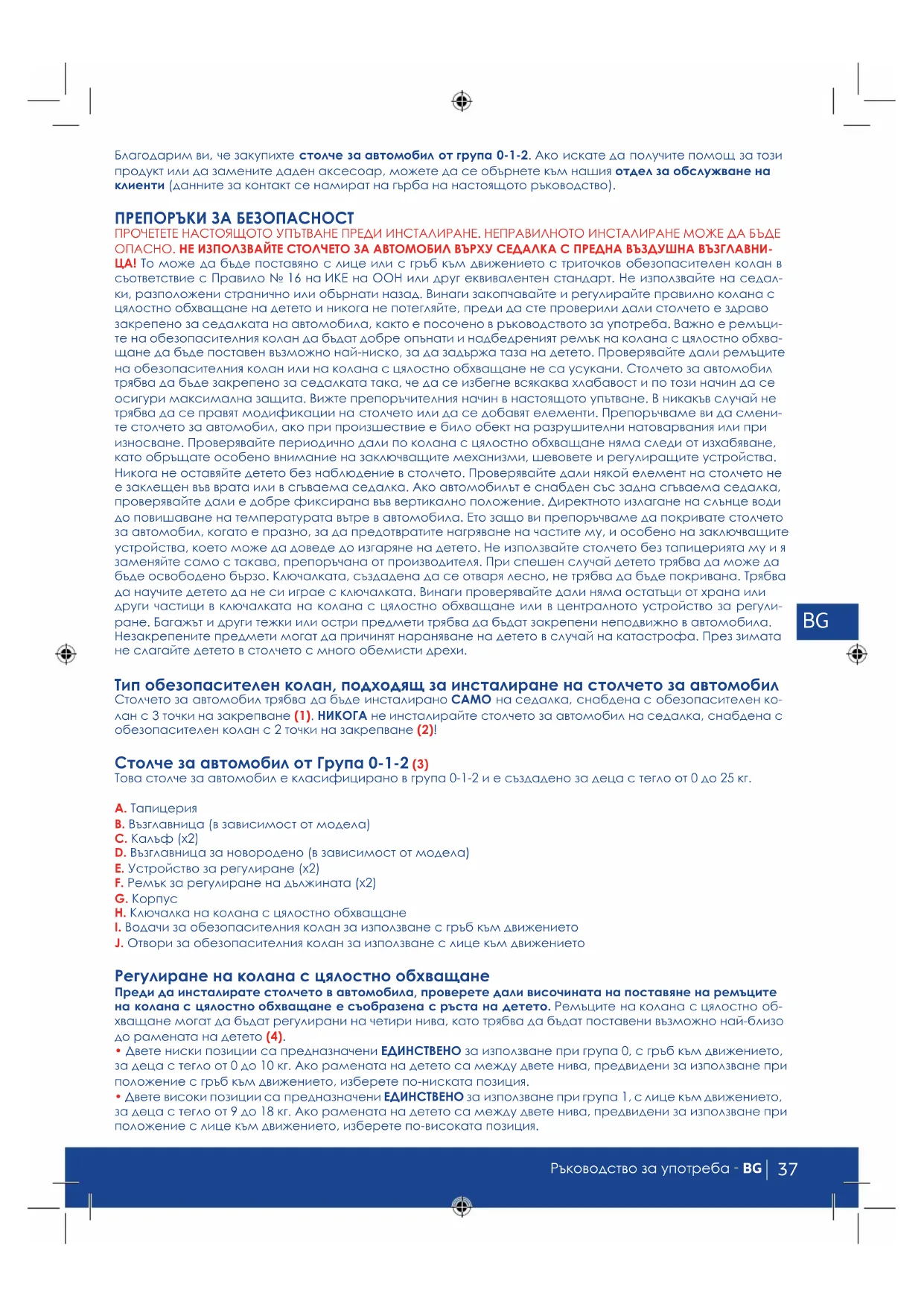 Благодарим ви, че закупихте столче за автомобил от група 0-1-2. Ако искате да получите помощ за този продукт или да замените даден аксесоар, можете да се обърнете към нашия отдел за обслужване на клиенти (данните за контакт се намират на гърба на настоящото ръководство). ПРЕПОРЪКИ ЗА БЕЗОПАСНОСТ ПРОЧЕТЕТЕ НАСТОЯЩОТО УПЪТВАНЕ ПРЕДИ ИНСТАЛИРАНЕ. НЕПРАВИЛНОТО ИНСТАЛИРАНЕ МОЖЕ ДА БЪДЕ ОПАСНО. НЕ ИЗПОЛЗВАЙТЕ СТОЛЧЕТО ЗА АВТОМОБИЛ ВЪРХУ СЕДАЛКА С ПРЕДНА ВЪЗДУШНА ВЪЗГЛАВНИ- ЦА! То може да бъде поставяно с лице или с гръб към движението с триточков обезопасителен колан в съответствие с Правило № 16 на ИКЕ на ООН или друг еквивалентен стандарт. Не използвайте на седал- ки, разположени странично или обърнати назад. Винаги закопчавайте и регулирайте правилно колана с цялостно обхващане на детето и никога не потегляйте, преди да сте проверили дали столчето е здраво закрепено за седалката на автомобила, както е посочено в ръководството за употреба. Важно е ремъци- те на обезопасителния колан да бъдат добре опънати и надбедреният ремък на колана с цялостно обхва- щане да бъде поставен възможно най-ниско, за да задържа таза на детето. Проверявайте дали ремъците на обезопасителния колан или на колана с цялостно обхващане не са усукани. Столчето за автомобил трябва да бъде закрепено за седалката така, че да се избегне всякаква хлабавост и по този начин да се осигури максимална защита. Вижте препоръчителния начин в настоящото упътване. В никакъв случай не трябва да се правят модификации на столчето или да се добавят елементи. Препоръчваме ви да смени- те столчето за автомобил, ако при произшествие е било обект на разрушителни натоварвания или при износване. Проверявайте периодично дали по колана с цялостно обхващане няма следи от изхабяване, като обръщате особено внимание на заключващите механизми, шевовете и регулиращите устройства. Никога не оставяйте детето без наблюдение в столчето. Проверявайте дали някой елемент на столчето не е заклещен във врата или в сгъваема седалка. Ако автомобилът е снабден със задна сгъваема седалка, проверявайте дали е добре фиксирана във вертикално положение. Директното излагане на слънце води до повишаване на температурата вътре в автомобила. Ето защо ви препоръчваме да покривате столчето за автомобил, когато е празно, за да предотвратите нагряване на частите му, и особено на заключващите устройства, което може да доведе до изгаряне на детето. Не използвайте столчето без тапицерията му и я заменяйте само с такава, препоръчана от производителя. При спешен случай детето трябва да може да бъде освободено бързо. Ключалката, създадена да се отваря лесно, не трябва да бъде покривана. Трябва да научите детето да не си играе с ключалката. Винаги проверявайте дали няма остатъци от храна или други частици в ключалката на колана с цялостно обхващане или в централното устройство за регули- ране. Багажът и други тежки или остри предмети трябва да бъдат закрепени неподвижно в автомобила. Незакрепените предмети могат да причинят нараняване на детето в случай на катастрофа. През зимата не слагайте детето в столчето с много обемисти дрехи. Тип обезопасителен колан, подходящ за инсталиране на столчето за автомобил Столчето за автомобил трябва да бъде инсталирано САМО на седалка, снабдена с обезопасителен ко- лан с 3 точки на з
