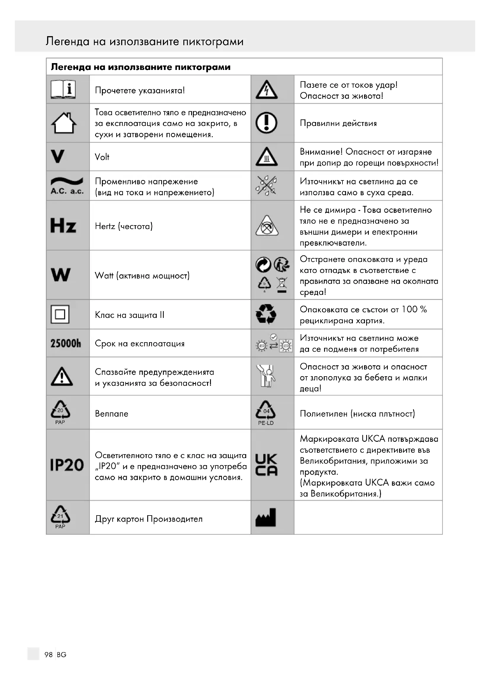 PE-LD Полиетилен (ниска плътност) Осветителното тяло е с клас на защита „IP20“ и е предназначено за употреба само на закрито в домашни условия. Маркировката UKCA потвърждава съответствието с директивите във Великобритания, приложими за