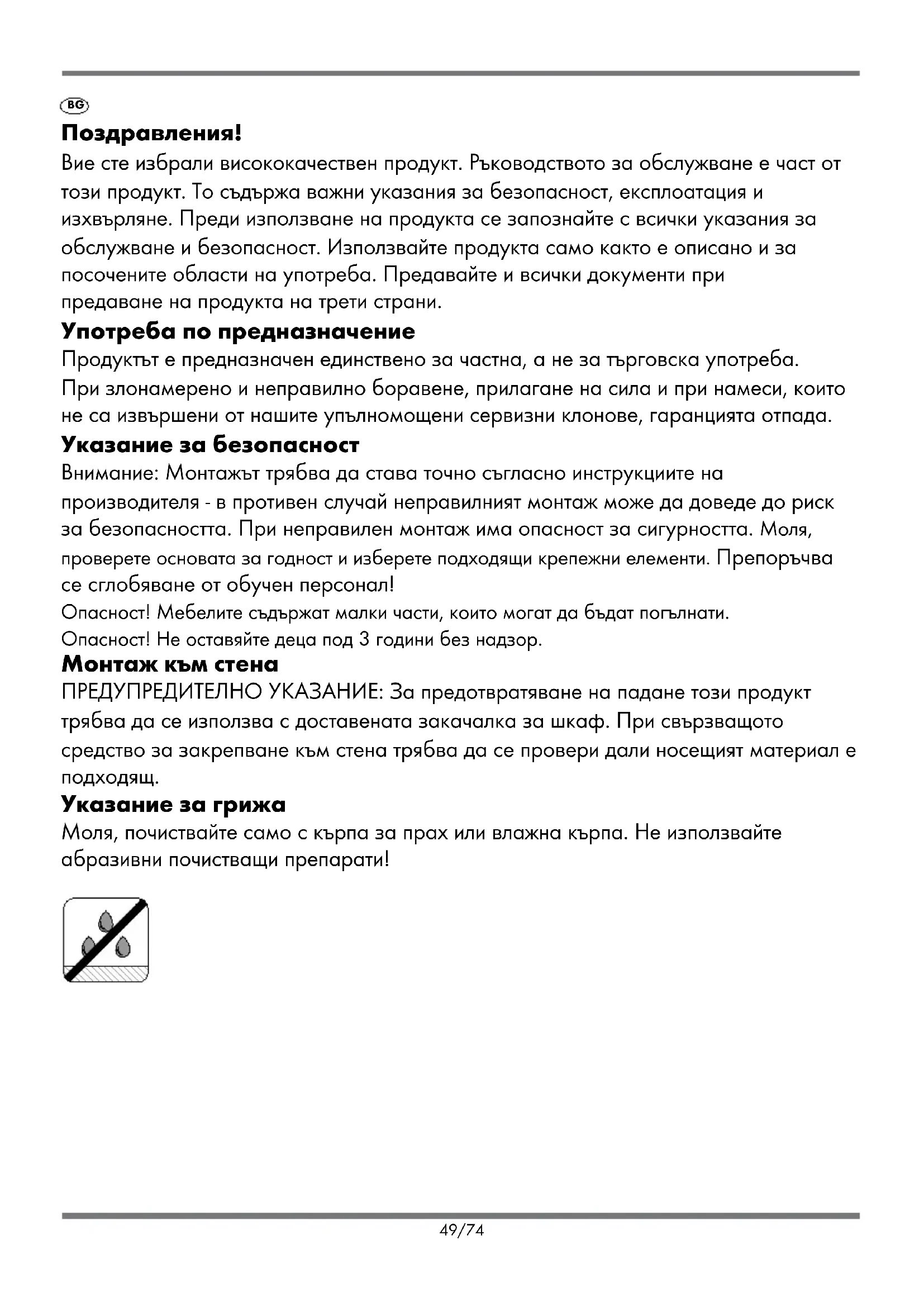teći ponovno samo za taj dio. Odlaganje Molimo Vas da pakiranje i proizvod nakon uporabe odložite na ekološki prihvatljiv način. 48/74BG Поздравления! Вие сте избрали висококачествен продукт. Ръководството за обслужване е част от този продукт. То съдържа важни указания за безопасност, експлоатация и изхвърляне. Преди използване на продукта се запознайте с всички указания за обслужване и безопасност. Използвайте продукта само както е описано и за посочените области на употреба. Предавайте и всички документи при предаване на продукта на трети страни. Употреба по предназначение Продуктът е предназначен единствено за частна, а не за търговска употреба. При злонамерено и неправилно боравене, прилагане на сила и при намеси, които не са извършени от нашите упълномощени сервизни клонове, гаранцията отпада. Указание за безопасност Внимание: Монтажът трябва да става точно съгласно инструкциите на производителя - в противен случай неправилният монтаж може да доведе до риск за безопасността. При неправилен монтаж има опасност за сигурността. Моля, проверете основата за годност и изберете подходящи крепежни елементи. Препоръчва се сглобяване от обучен персонал! Опасност! Мебелите съдържат малки части, които могат да бъдат погълнати. Опасност! Не оставяйте деца под 3 години без надзор. Монтаж към стена ПРЕДУПРЕДИТЕЛНО УКАЗАНИЕ: За предотвратяване на падане този продукт трябва да се използва с доставената закачалка за шкаф. При свързващото средство за закрепване към стена трябва да се провери дали носещият материал е