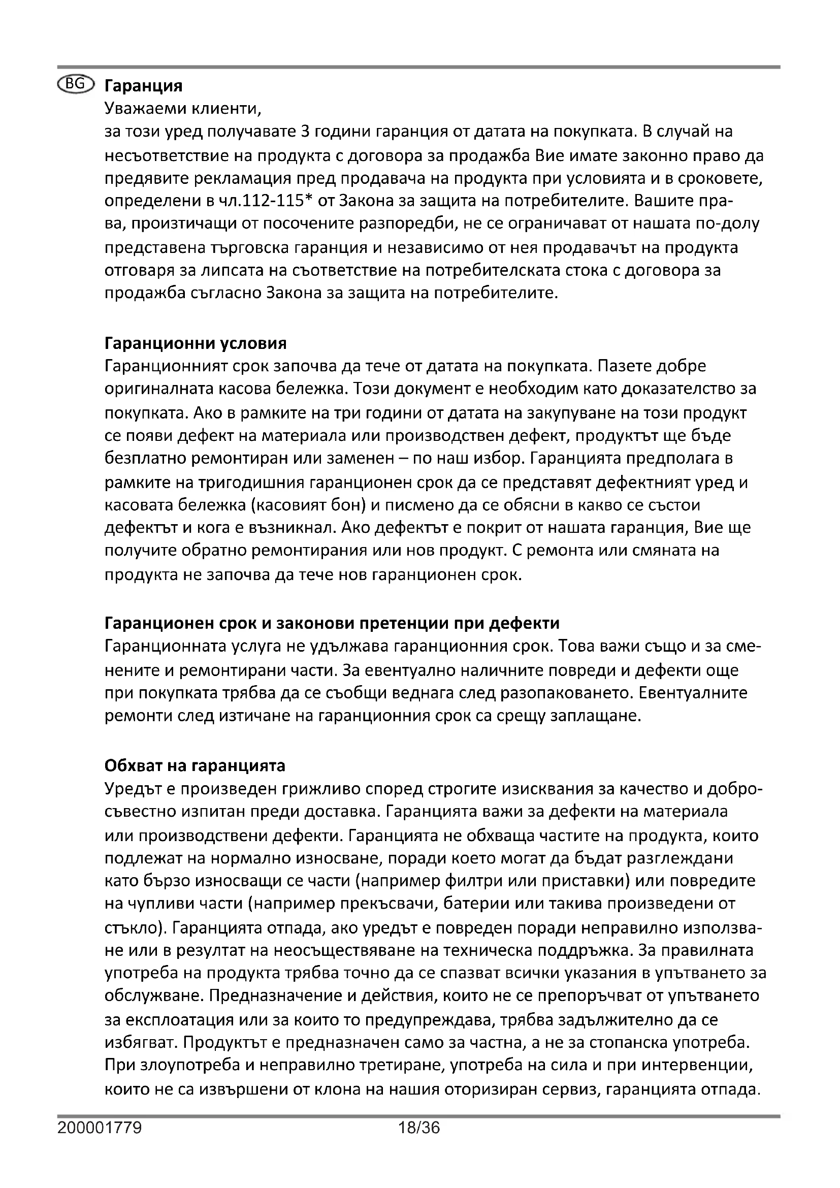 Уважаеми клиенти, за този уред получавате 3 години гаранция от датата на покупката. В случай на несъответствие на продукта с договора за продажба Вие имате законно право да предявите рекламация пред продавача на продукта при условията и в сроковете, определени в чл.112-115* от Закона за защита на потребителите. Вашите пра- ва, произтичащи от посочените разпоредби, не се ограничават от нашата по-долу представена търговска гаранция и независимо от нея продавачът на продукта отговаря за липсата на съответствие на потребителската стока с договора за продажба съгласно Закона за защита на потребителите. Гаранционни условия Гаранционният срок започва да тече от датата на покупката. Пазете добре оригиналната касова бележка. Този документ е необходим като доказателство за покупката. Ако в рамките на три години от датата на закупуване на този продукт се появи дефект на материала или производствен дефект, продуктът ще бъде безплатно ремонтиран или заменен – по наш избор. Гаранцията предполага в рамките на тригодишния гаранционен срок да се представят дефектният уред и касовата бележка (касовият бон) и писмено да се обясни в какво се състои дефектът и кога е възникнал. Ако дефектът е покрит от нашата гаранция, Вие ще получите обратно ремонтирания или нов продукт. С ремонта или смяната на продукта не започва да тече нов гаранционен срок. Гаранционен срок и законови претенции при дефекти Гаранционната услуга не удължава гаранционния срок. Това важи също и за сме- нените и ремонтирани части. За евентуално наличните повреди и дефекти още при покупката трябва да се съобщи веднага след разопаковането. Евентуалните ремонти след изтичане на гаранционния срок са срещу заплащане. Обхват на гаранцията Уредът е произведен грижливо според строгите изисквания за качество и добро- съвестно изпитан преди доставка. Гаранцията важи за дефекти на материала или производствени дефекти. Гаранцията не обхваща частите на продукта, които подлежат на нормално износване, поради което могат да бъдат разглеждани като бързо износващи се части (например филтри или приставки) или повредите на чупливи части (например прекъсвачи, батерии или такива произведени от стъкло). Гаранцията отпада, ако уредът е повреден поради неправилно използва- не или в резултат на неосъществяване на техническа поддръжка. За правилната употреба на продукта трябва точно да се спазват всички указания в упътването за обслужване. Предназначение и действия, които не се препоръчват от упътването за експлоатация или за които то предупреждава, трябва задължително да се избягват. Продуктът е предназначен само за частна, а не за стопанска употреба. При злоупотреба и неправилно третиране, употреба на сила и при интервенции, които не са извършени от клона на нашия оторизиран сервиз, гаранцията отпада.