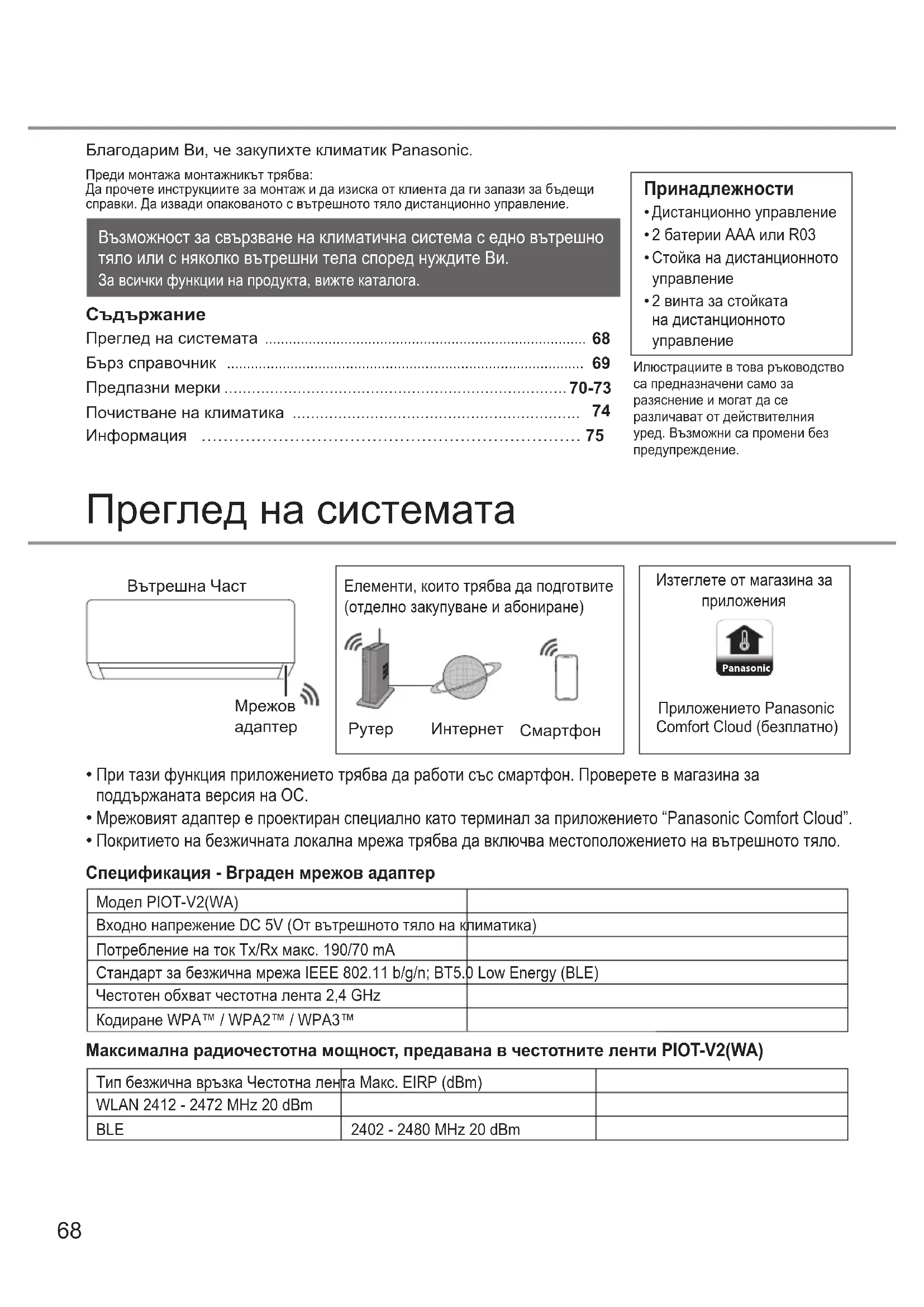Информация …………………………………………………………… 75 Модел PIOT-V2(WA) Входно напрежение DC 5V (От вътрешното тяло на климатика) Потребление на ток Tx/Rx макс. 190/70 mA Стандарт за безжична мрежа IEEE 802.11 b/g/n; BT5.0 Low Energy (BLE) Честотен обхват честотна лента 2,4 GHz Кодиране WPA™ / WPA2™ / WPA3™ Спецификация - Вграден мрежов адаптер Максимална радиочестотна мощност, предавана в честотните ленти PIOT-V2(WA) Тип безжична връзка Честотна лента Макс. EIRP (dBm) WLAN 2412 - 2472 MHz 20 dBm BLE 2402 - 2480 MHz 20 dBm69