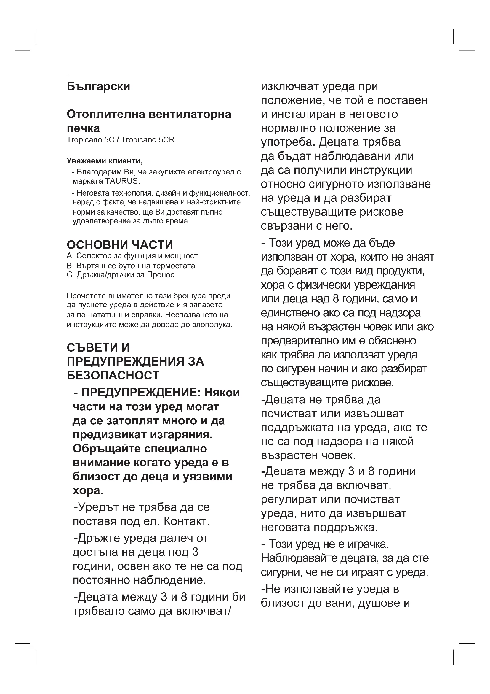 Tropicano 5C / Tropicano 5CR Уважаеми клиенти, - Благодарим Ви, че закупихте електроуред с марката TAURUS. - Неговата технология, дизайн и функционалност, наред с факта, че надвишава и най-стриктните норми за качество, ще Ви доставят пълно удовлетворение за дълго време. ОСНОВНИ ЧАСТИ A Селектор за функция и мощност B Въртящ се бутон на термостата C Дръжка/дръжки за Пренос Прочетете внимателно тази брошура преди да пуснете уреда в действие и я запазете за по-нататъшни справки. Неспазването на инструкциите може да доведе до злополука.