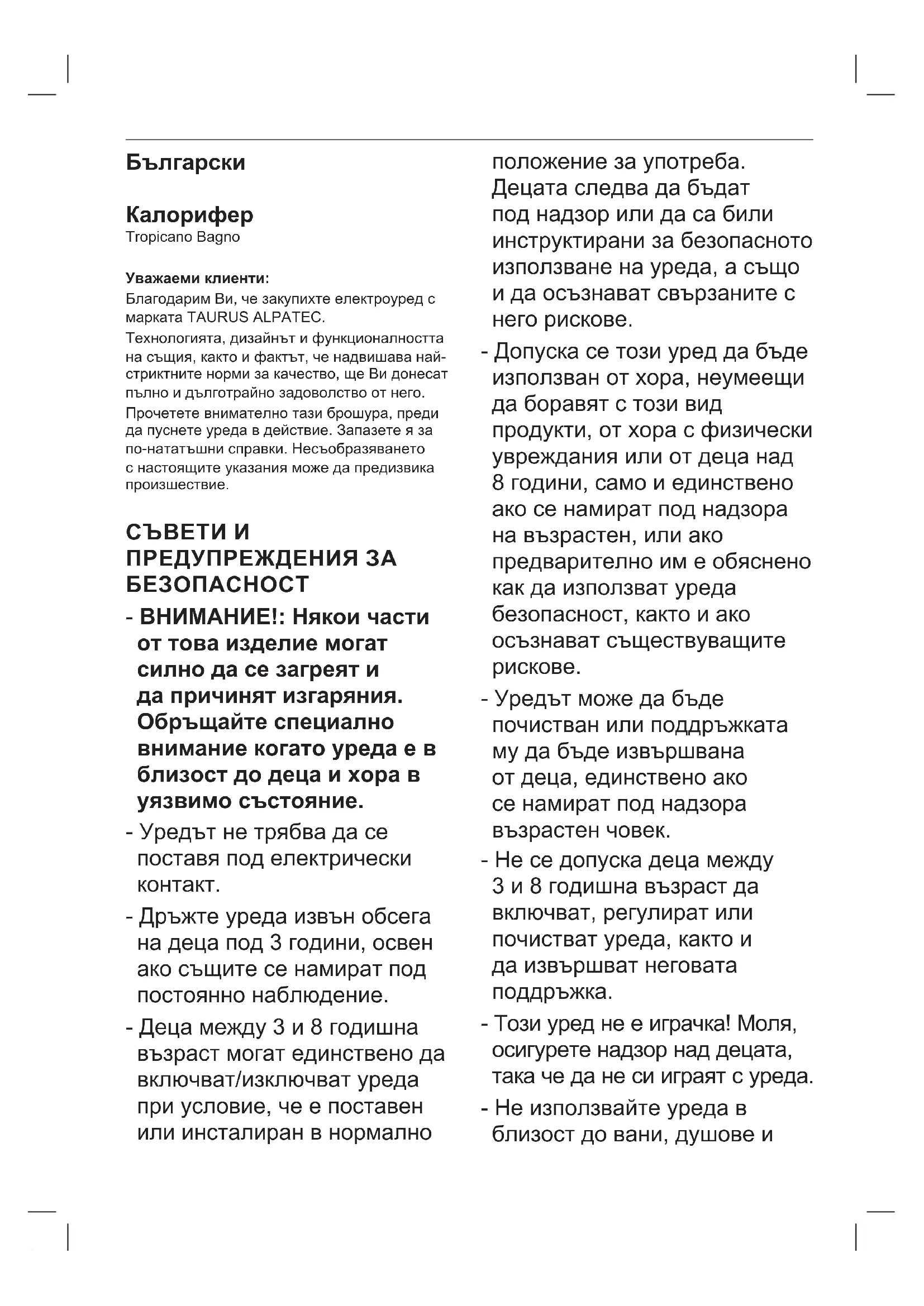 Tropicano Bagno Уважаеми клиенти: Благодарим Ви, че закупихте електроуред с марката TAURUS ALPATEC. Технологията, дизайнът и функционалността на същия, както и фактът, че надвишава най- стриктните норми за качество, ще Ви донесат пълно и дълготрайно задоволство от него. Прочетете внимателно тази брошура, преди да пуснете уреда в действие. Запазете я за по-нататъшни справки. Несъобразяването с настоящите указания може да предизвика произшествие.