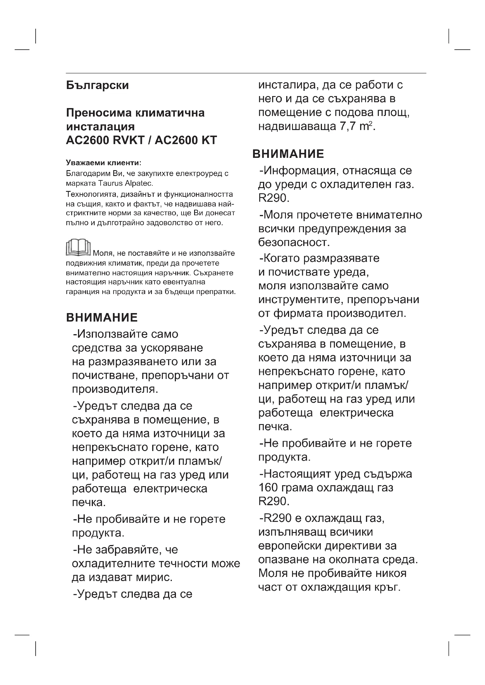 Уважаеми клиенти: Благодарим Ви, че закупихте електроуред с марката Taurus Alpatec. Технологията, дизайнът и функционалността на същия, както и фактът, че надвишава най- стриктните норми за качество, ще Ви донесат пълно и дълготрайно задоволство от него. Моля, не поставяйте и не използвайте подвижния климатик, преди да прочетете внимателно настоящия наръчник. Съхранете настоящия наръчник като евентуална гаранция на продукта и за бъдещи препратки.