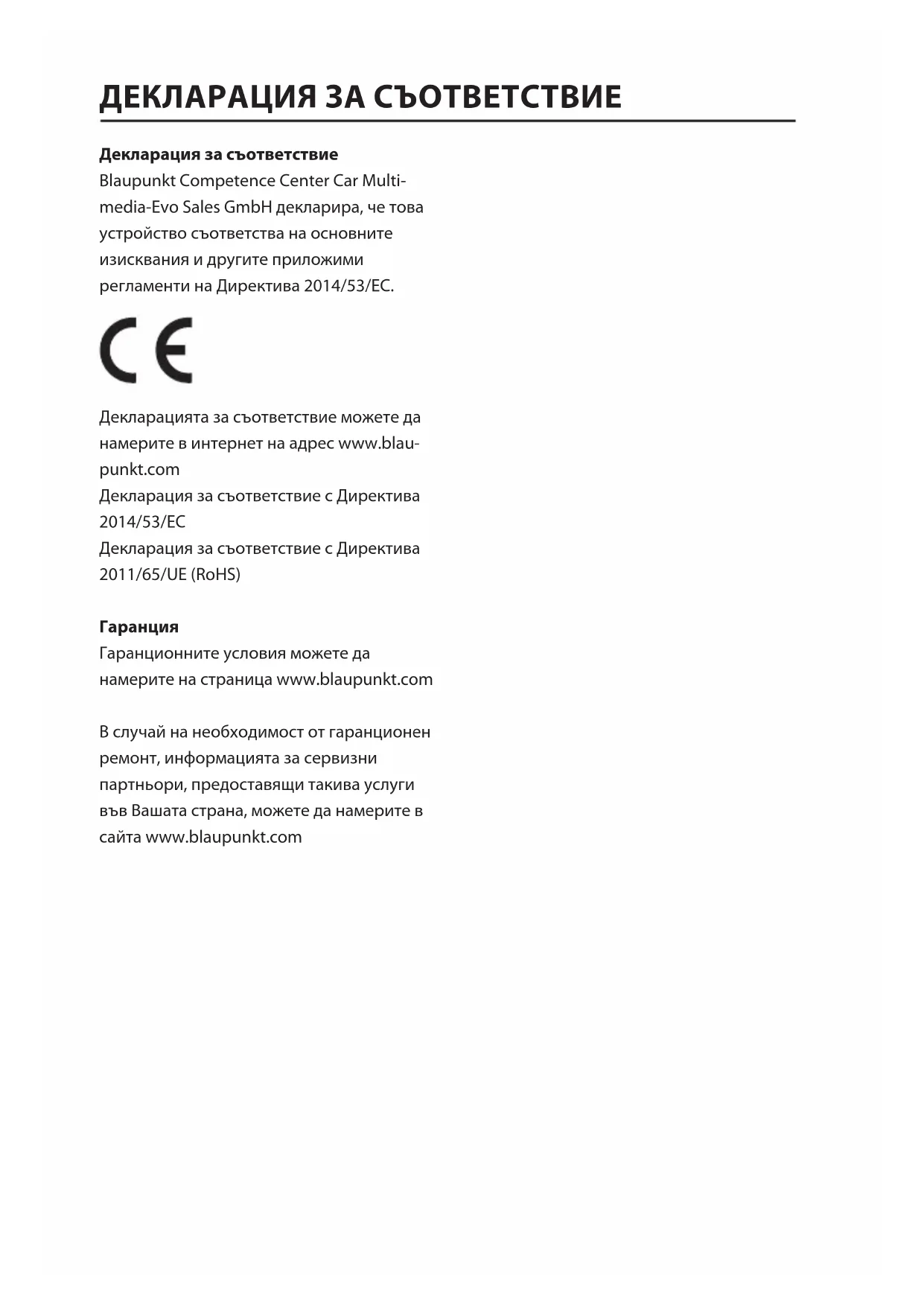 BPA 1121 BT Manual.indd 109 05.10.2021 16:15:36Декларация за съответствие Blaupunkt Competence Center Car Multi- media-Evo Sales GmbH декларира, че това устройство съответства на основните изисквания и другите приложими регламенти на Директива 2014/53/ЕС. Декларацията за съответствие можете да намерите в интернет на адрес www.blau- punkt.com Декларация за съответствие с Директива 2014/53/ЕС Декларация за съответствие с Директива 2011/65/UE (RoHS)