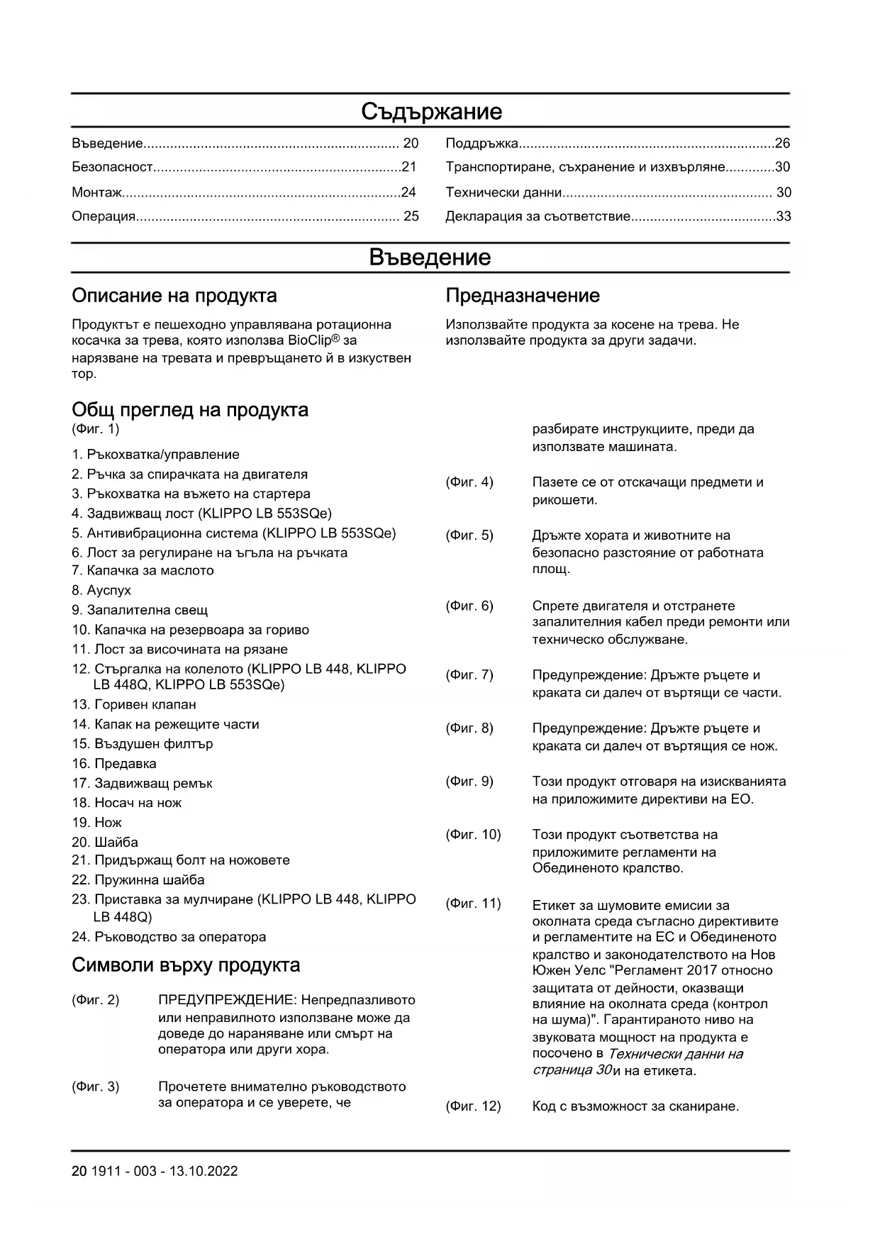 32 1911 - 003 - 13.10.2022Декларация за съответствие Декларация за съответствие на EС Ние, Husqvarna AB, SE-561 82 Huskvarna, Швеция, тел.: +46-36-146500, декларираме на своя собствена отговорност, че продуктът: Описание Косачка за трева Марка Husqvarna Тип/модел KLIPPO LB 448, KLIPPO LB 442Q, KLIPPO LB 448Q, KLIPPO LB 553SQe Идентификация Серийни номера от 2022 и нататък отговаря напълно на следните директиви и регламенти на ЕС: Директива/регла-