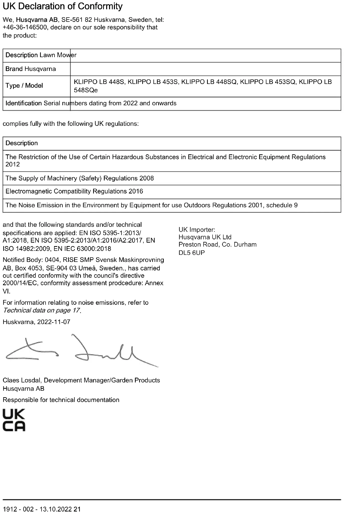 34 1912 - 002 - 13.10.2022Декларация за съответствие Декларация за съответствие на EС Ние, Husqvarna AB, SE-561 82 Huskvarna, Швеция, тел.: +46-36-146500, декларираме на своя собствена отговорност, че продуктът: Описание Косачка за трева Марка Husqvarna