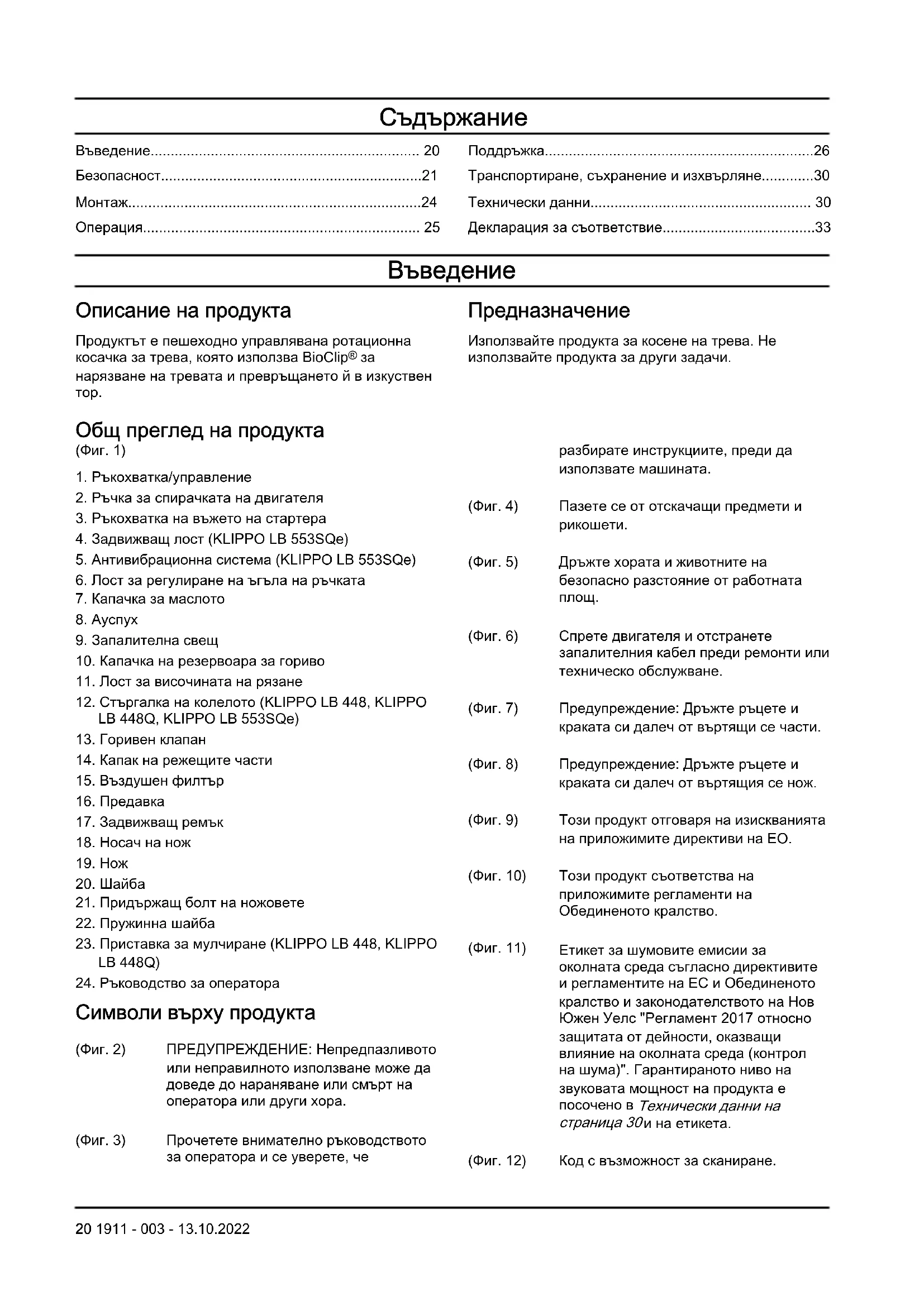 32 1911 - 003 - 13.10.2022Декларация за съответствие Декларация за съответствие на EС Ние, Husqvarna AB, SE-561 82 Huskvarna, Швеция, тел.: +46-36-146500, декларираме на своя собствена отговорност, че продуктът: Описание Косачка за трева Марка Husqvarna Тип/модел KLIPPO LB 448, KLIPPO LB 442Q, KLIPPO LB 448Q, KLIPPO LB 553SQe Идентификация Серийни номера от 2022 и нататък отговаря напълно на следните директиви и регламенти на ЕС: Директива/регла-