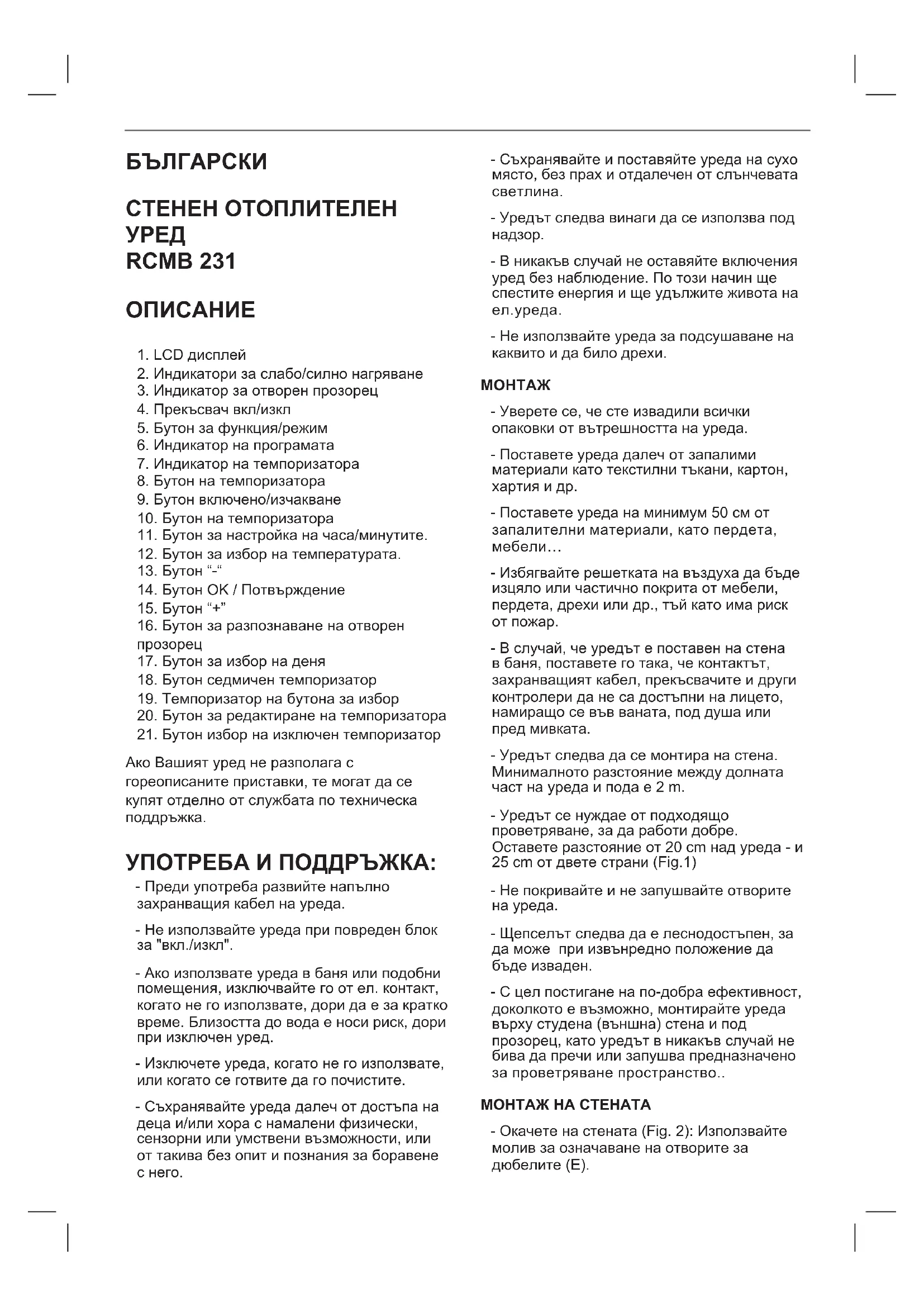 - Щепселът следва да е леснодостъпен, за да може при извънредно положение да бъде изваден. - С цел постигане на по-добра ефективност, доколкото е възможно, монтирайте уреда върху студена (външна) стена и под прозорец, като уредът в никакъв случай не бива да пречи или запушва предназначено за проветряване пространство.. МОНТАЖ НА СТЕНАТА - Окачeте на стената (Fig. 2): Използвайте молив за означаване на отворите за дюбелите (E).- Уверете се, че диаметърът на отворите съответства на диаметъра на дюбелите. - Пробийте два отвора в предварително означените зони (Fig. 2). - Вкарайте дюбелите (E) в отворите. - След вкарването на дюбелите завийте два винта (D), оставяйки разстояние от около 10 mm между главата на винтовете и стената. - Уверете се, че винтовете са добре закрепени, преди да окачите уреда. - Използвайте отворите зад уреда, за да го закачите за главите на двата винта. - Уверете, се, че уредът е окачен правилно и безопасно посредством винтовете. НАЧИН НА УПОТРЕБА Забележки преди употреба: Уверете се, че изцяло сте отстранили опаковката на уреда. Някои части на уреда са леко смазани, поради което, при включване за първи път е възможно уредът да започне слабо да дими. Скоро след това, димът ще изчезне. За да премахнете миризмата, отделяща се при първата употреба на уреда, препоръчва се да го поддържате включен на на максимална мощност в продължение 2 часа, в добре проветрено помещение. Подгответе уреда в зависимост от желания режим (функция): МОЛЯ, ИЗКЛЮЧЕТЕ УРЕДА ИЗТЕГЛЕТЕ НАПЪЛНО КАБЕЛА, ПРЕДИ ДА ГО ВКЛЮЧИТЕ.. - Включете уреда към електрозахранването. - За включване на електроуреда, моля придвижете прекъсвача вкл/изкл (4), намиращ се отстрани на уреда в положение „включено“. Това положение е означено със символа „I“. Екранът LCD ще се включи, с което указва, че уредът е включен и нагревателят автоматично преминава в изчаквателен режим (символът „S“ на екрана), докато се натисне бутон или се направи някакъв избор. - За изключване на уреда, поставете прекъсвача за вкл/изкл,намиращ се отстрани на уреда в положение „изключване“, представена от символа „О“ Екранът LCD и всички индикатори ще се изключат и уредът ще престане да работи. ОБЩА УПОТРЕБА: РЕЖИМ „ИЗЧАКВАНЕ“/ АВТОМАТИЧЕН